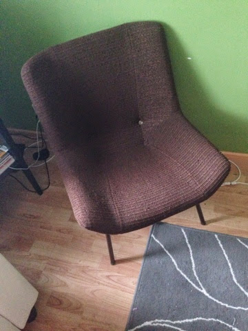 Joku naapuri oli kantanu tollasen kivan ruskeen tuolin roskakatokseen, joten mä kannoin sen kotiin. Toi on ihana ja käy niin hyvin meidän sisustukseen. Väri on aikalailla prikulleen sama ku meidän olohuoneen hyllyt ja tv-taso. Olohuone on tällä hetkellä aika sekasorto:D