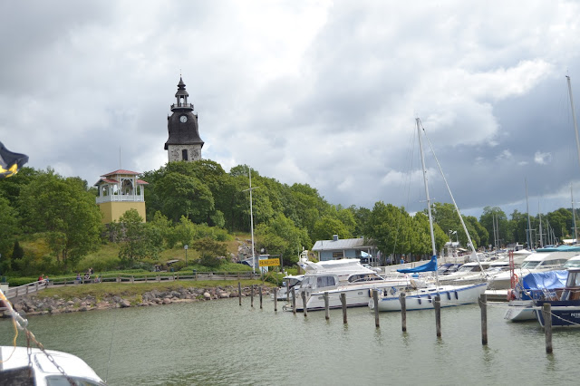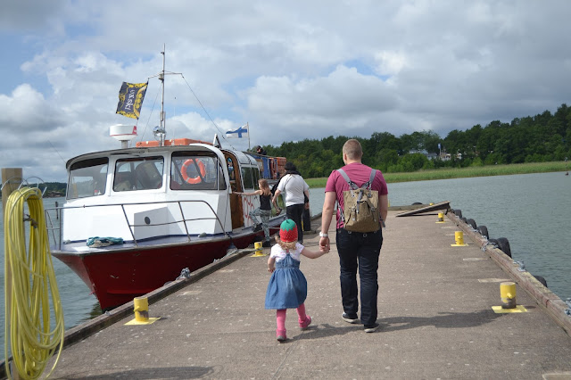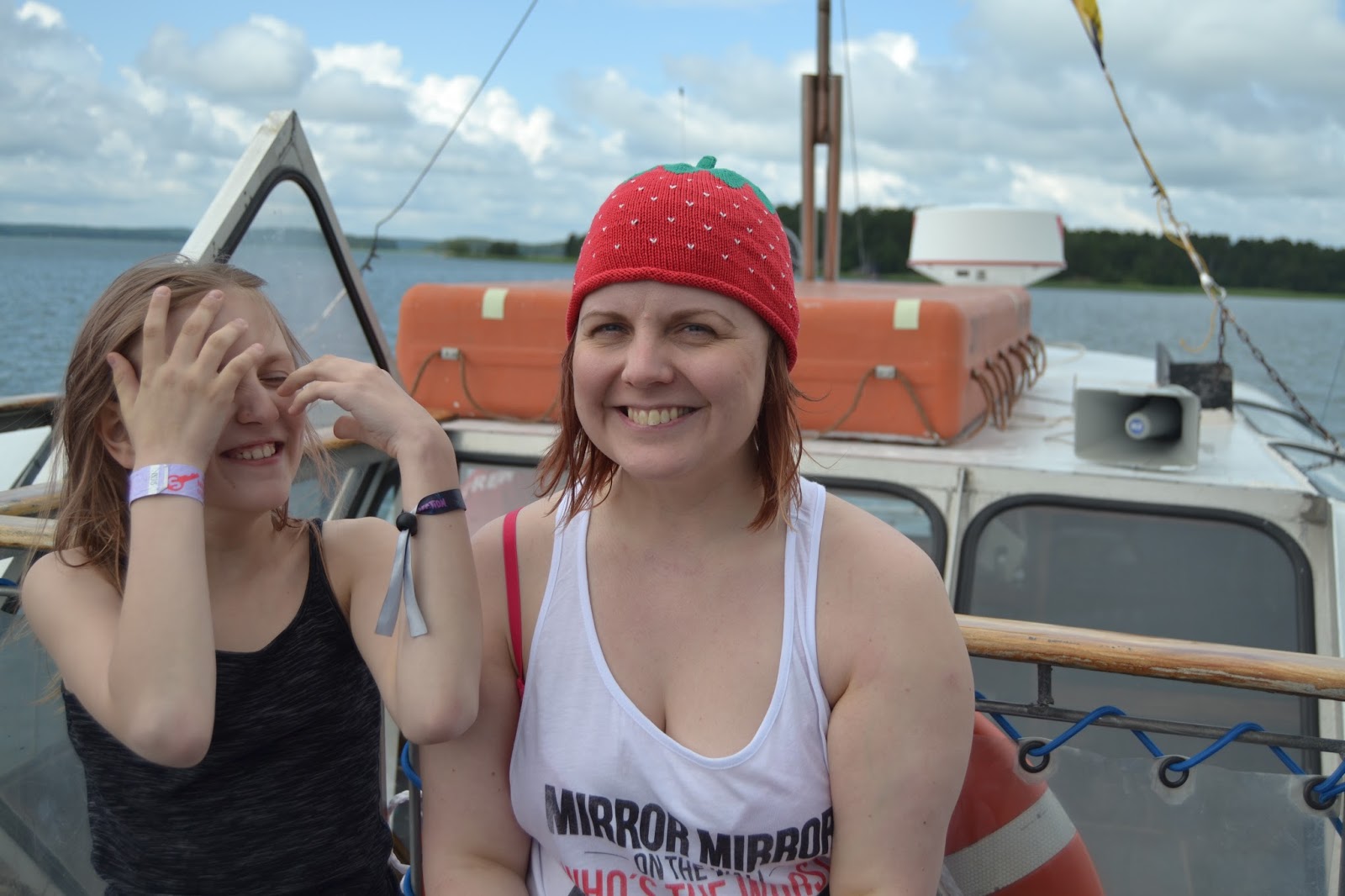 Matka saarelle taittui laivalla. Emme olleet katsoneet aikatauluja valmiiksi ja kävelimme leirintäalueelta laiturille. Kävimme lipunmyynnistä kysymässä aikataulua ja seuraava laiva olikin lähdössä juuri sillä minuutilla. Juoksujalkaa ehdimme laivaan. Istuimme kannella, koska ilma oli mukavan lämmin, mutta hatun tai edes pompulan tuonne olisi tarvinnut, kun hiukset olivat silmillä koko ajan. Laiva ohitti Muumimaailman ja kivasti näkyi sekä Muumitalo että Drontti Edvard.