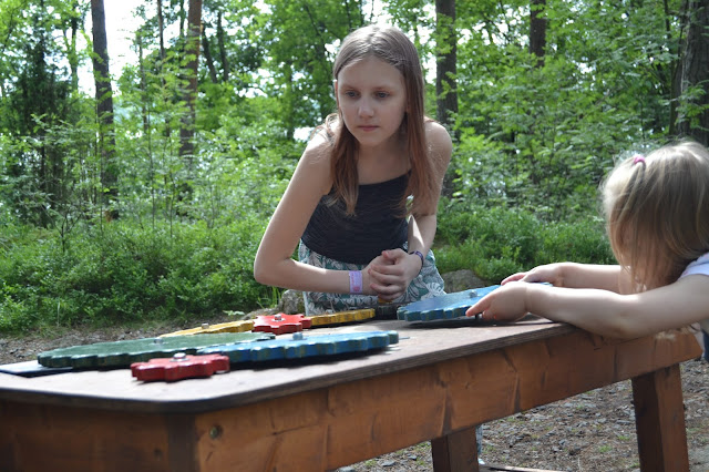 Osa pisteistä oli todella kuluneita ja ehkä kunnostuksen tarpeessa, kuten tämä, jossa piti koota osat pöydälle oikeassa järjestyksessä niin, että punainen pyörä pyörii. Kaipailimme useampaa pöytää, koska yhden perheen tehdessä tehtävää useampi perhe kasaantui jonottamaan. Punainen pyörä oli myös hyvin jäykkä eikä sitä meinannut saada pyöritettyä edes käsillä.