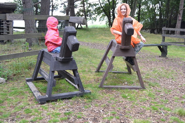 Meidän perheen suurimmat hitit olivat varmastikin kotieläimet ja jousiammunta. B:lle ei saarella oikein ollut mitään, mutta kouluikäisille sitä taidetaankin markkinoida. Kalliokiipeilyyn oli sen verran pitkä jono ja satoi vettä kaatamalla, että jätettiin se välistä.
