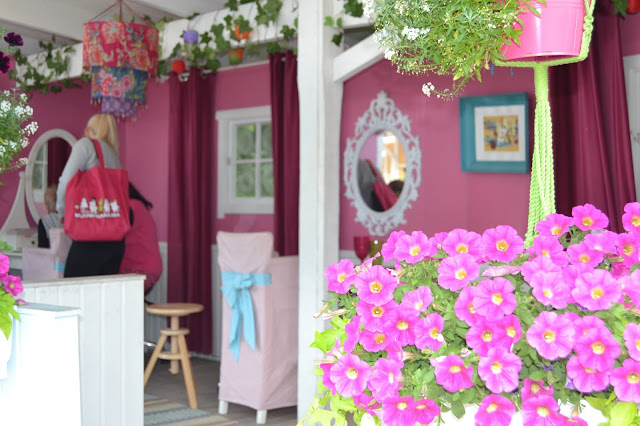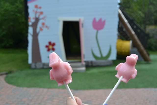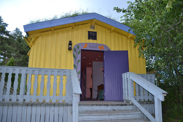 Tämän kesän teema on Muumipeikko rakentaa talon ja siellä oli oikeasti Muumipeikon rakentama talo. Ihasteltiin sitä J:n kanssa joka kerta ohi kulkiessamme. Taloon oli portaat ylös ja liukumäki alas.