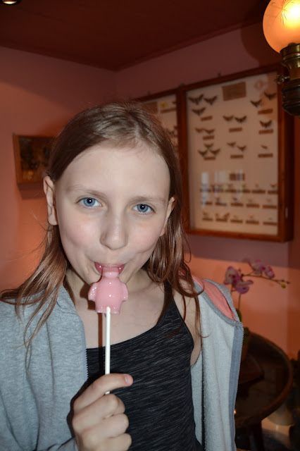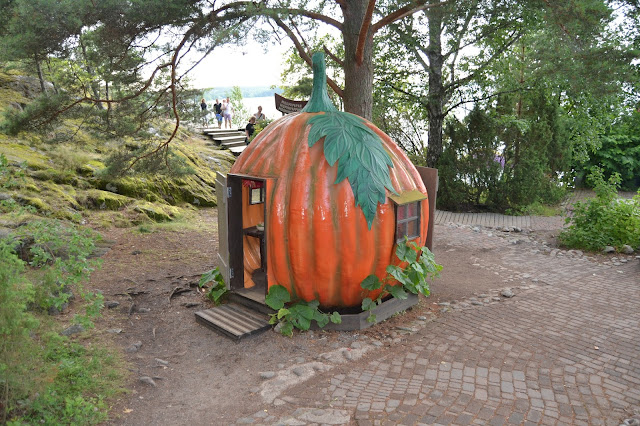 Käytiin Hemulinkin talossa ihastelemassa perhoskokoelmia ja kaikkia kivoja kukkapurnukoita. Ihmeteltiin myös syökö Hemuli käpyjä, koska niitä oli pöydällä iso kipollinen. Talon takana oli vielä kurpitsa, johon Pikku Myy tekee itselleen majan. Kurpitsaan pääsi jopa sisälle leikkimään.