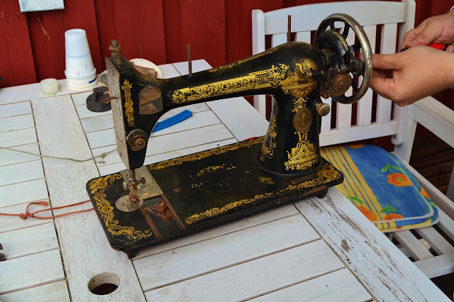 Tehtiin J:n kanssa mahtava löytö nettikirpparilta. Joku lahjoitti vanhan Singerin ja siihen kuuluvan Tikkakosken jalan! Pöytälevy puuttuu ja jotkut osat Singeristä on aika ruosteessa, mutta J rakastaa tällaisia projekteja ja alkoikin heti ihan innoissaan mittailemaan ja suunnittelemaan millainen pöytälevy tuohon pitää rakentaa.