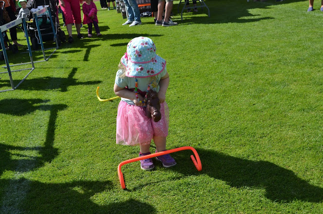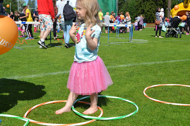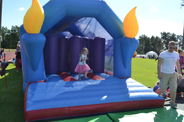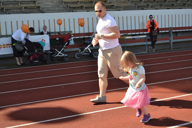 Tapahtuma toimi siis lasten olympialaisten malliin. Oli eri pisteitä, joilla piti tehdä eri liikuntasuorituksia. Oli keppihevosjuoksua, esterataa, pomppulinnaa ja jopa sumopainia. B ei oikein hoksannut keppihevosjuoksussa kuinka esteiden yli hypätään ja kaatoikin jokaisen aina mennessään. Toinen esterata menikin sitten jo paljon paremmin. Parasta taisi kuitenkin olla minimaraton isin kanssa.