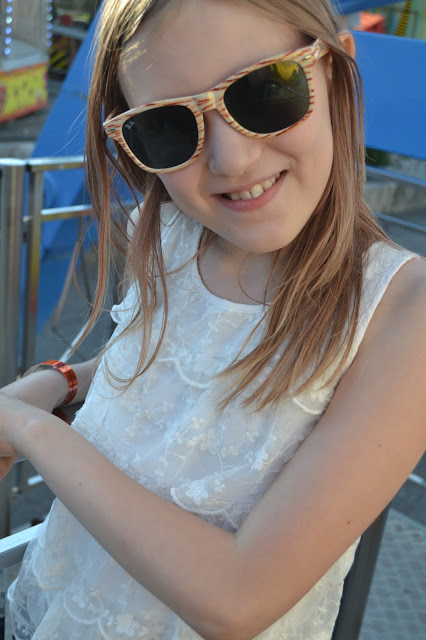 Lissun kummitäti halusi viedä Lissun perjantaina yötivoliin, kun sellainen Kuopiossa oli. Mentiin noin kuuden aikaan illalla, joten kuvissa on vielä tosi valoisaa. Lissulle ostettiin ranneke ja minä ostin itselleni kertalipun maailmanpyörään, koska Lissu ei halunnut mennä yksin ja Lissun kummitäti kammoaa korkeita paikkoja.