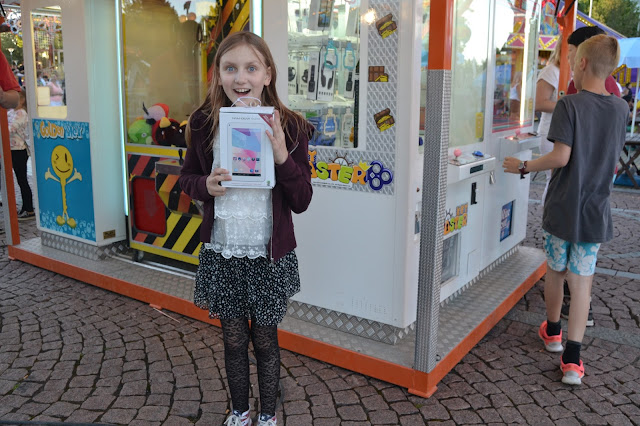 Lissu voitti tabletin! Tabletti jäi vielä poikittain koneeseen jumiin, joten jouduttiin hakemaan henkilökunta avuksi ja hirmuinen kasa ihmisiä kerääntyi katsomaan. Uskomatonta, koska olen aina kuvitellut, ettei noista koneista kukaan koskaan mitään voita.