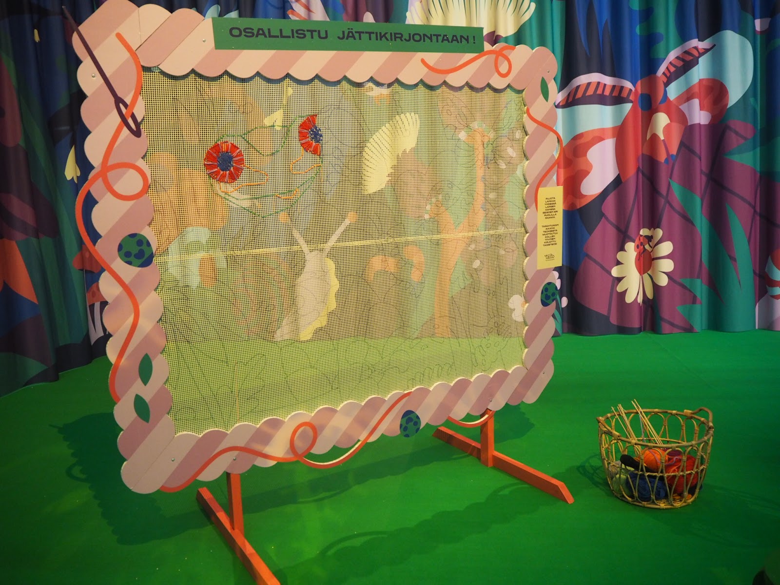 Me katselimme Vivian kanssa hetken kirjaa ötököistä, mutta ei se kovin kauan jaksanut kiinnostaa. Alueella oli myös jättikirjontapiste, mutta sekin oli meille hieman liian vaativaa. Isomman lapsen kanssa se olisi ehkä toiminutkin.
