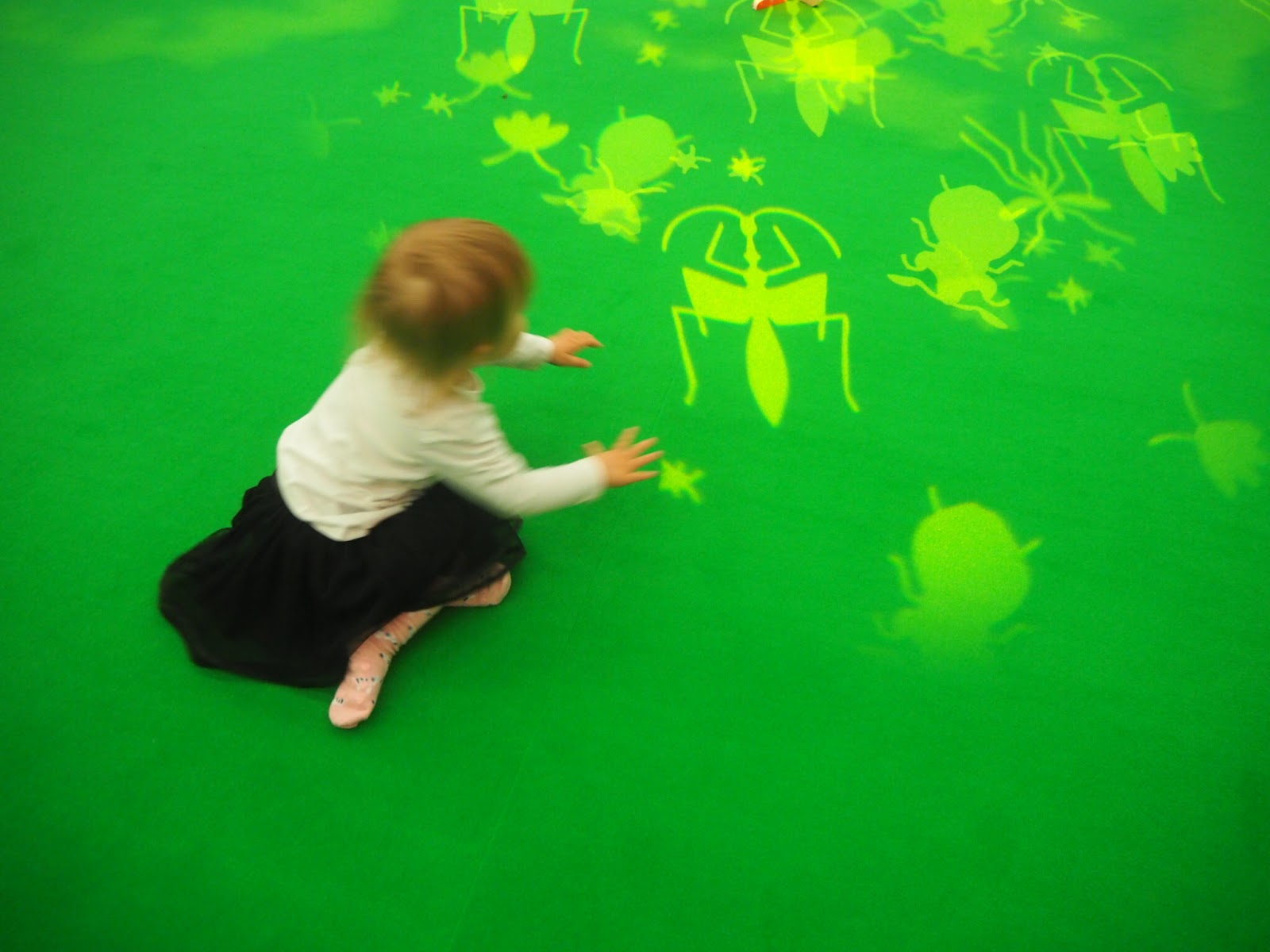 Vivia innostui heti lattiaan heijastuvista ötököistä, kun huomasi ne. Jahtasimmekin niitä monta kertaa ja joka kerta ne olivat yhtä hauskoja. Täyden leikkipaikan lattiasta ne eivät ehkä kuitenkaan ihan niin hyvin erotu.