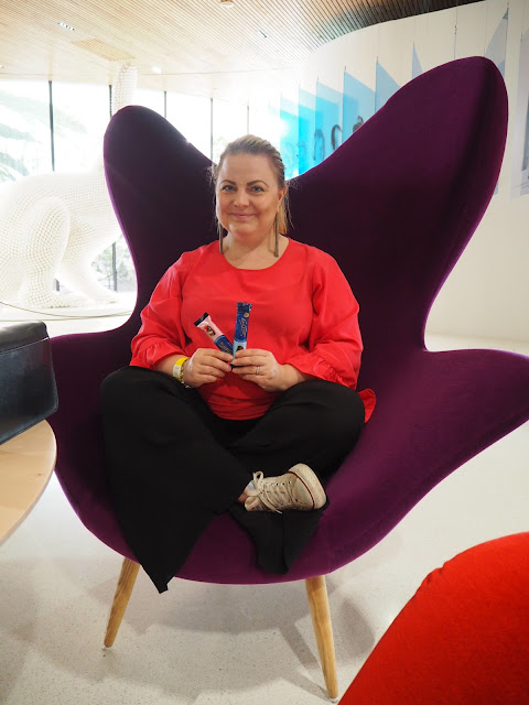 Paikalla pääsi kurkistamaan tehtaisiin virtuaalisesti. Tarjolla oli kurkistuspalloja kuin VR-lasitkin. Samalla opas koko ajan kertoi meille faktoja Fazerista, kuten esimerkiksi sen, että Martti Ahtisaari vie aina valtiovierailuilla tuliaisina PAX-pastilleja, koska Pax on latinaksi rauha. Opimme myös, että Dumle oli alunperin ruotsalainen tikkari, jonka Carl Fazerin poika Sven osti ja muutti karkiksi.