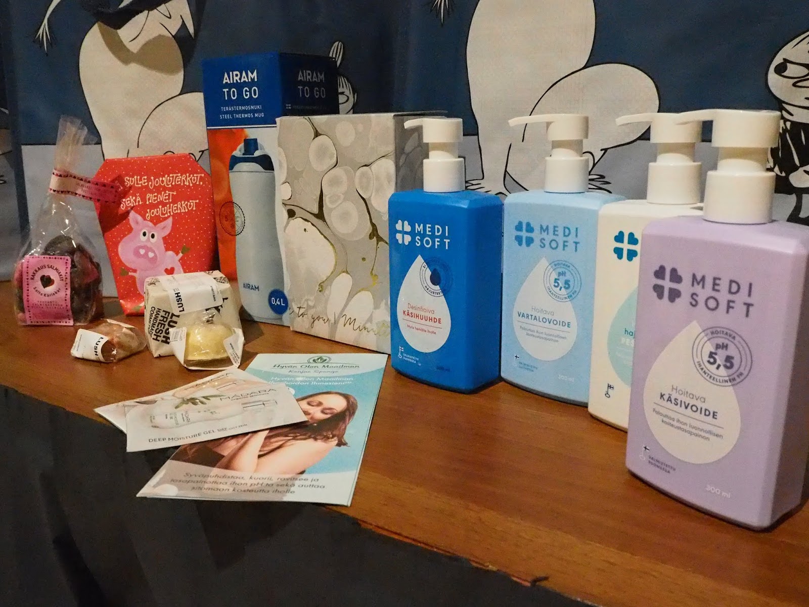 Meillä oli myös ihan huikea goodie bag, jossa oli sisällä Medisoftin saippuaa, rasvaa ja käsidesiä, Airamin termospullo, Dermosilin shampoo ja hoitoaine, Namituvan joulunameja ja Lushin saippuaa sekä kylpypommeja. Lushin tuotteet tosin jäi minulta suosiolla jollekin muulle, koska tuoksuyliherkkyys estää niiden käytön vaikka ne ihania muuten olisikin. Kaikki goodie bagin tuotteet oli pakattu vielä Muumi-kestokassiin.