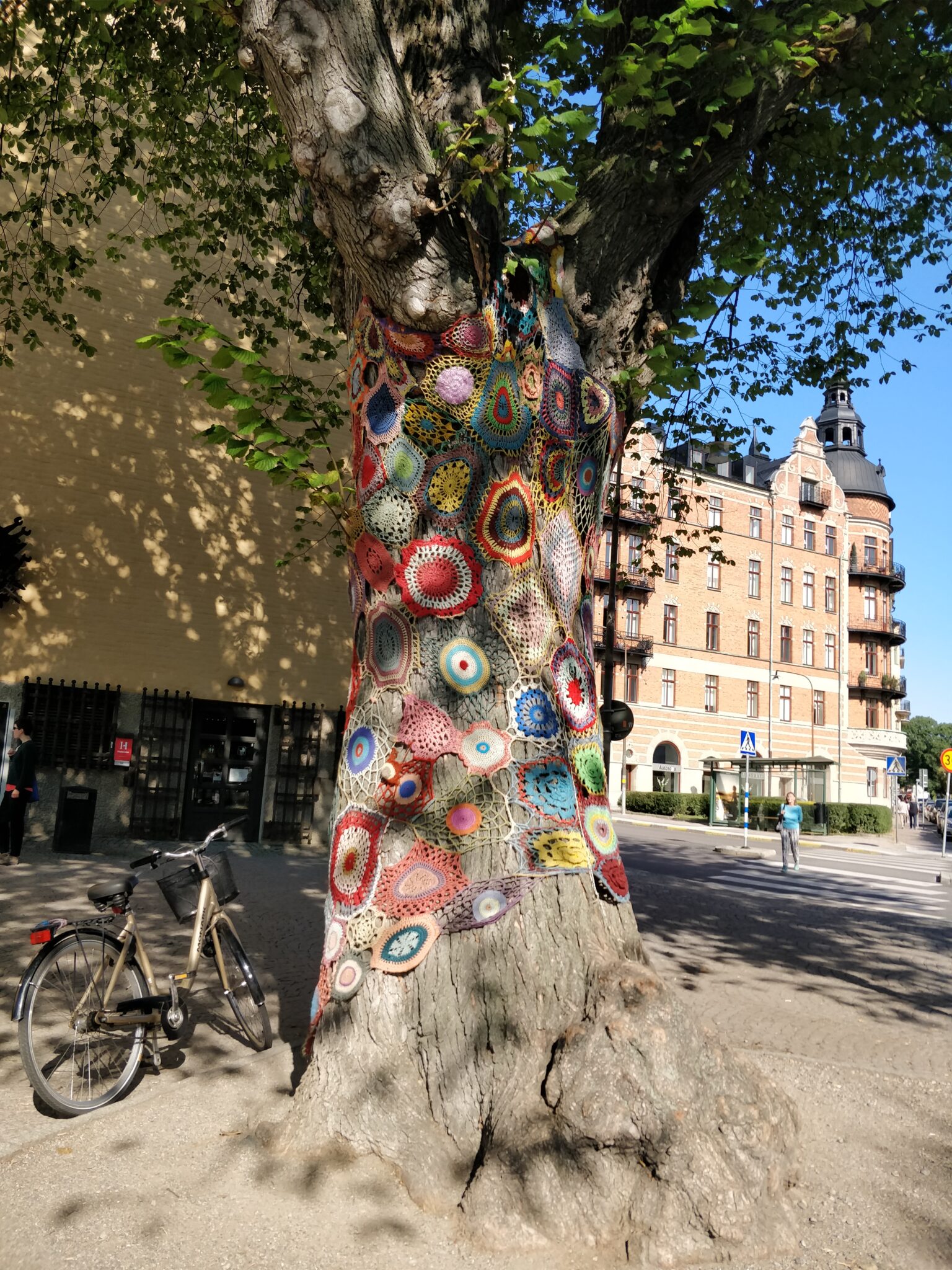 | Historiska museet oli helppo tunnistaa kesällä museon edessä olevan puun rungosta, joka oli koristeltu virkkaamalla.