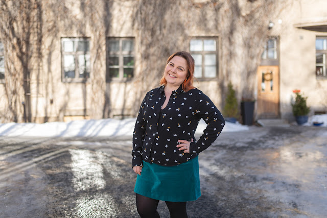 Päälle valikoitui yksi minun lempihameistani. Hame on smaragdinvihreää samettia ja se on päällä ihan supermukava. Se ei harmillisesti ole mahtunut kiinni kesän jälkeen ja olin ihmeissäni, että vetoketju oikeasti sulkeutui. Kärsin kuvien oton aikaan turvotuksesta, mutta siltikään hame ei puristanut. Ilmeisesti vartaloni on johonkin suuntaan muokkaantunut vaikka en sitä itse ole tajunnut.