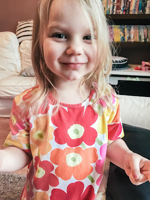 Meillä oli muuten Melissan kanssa samanlaiset mekot Marimekolta, kun Melissa oli pieni taapero. Minulla oli liikkeestä ostettu vaaleanpunainen kotelomekko ja ompelin Melissalle saman kuosin vaaleansinisestä kankaasta oman mekon. Meillä oli mekot päällä mummoni ja hänen kaksoissiskonsa 80-vuotissyntymäpäivillä, mutta harmikseni meistä ei ole juhlista yhtään kunnollista yhteiskuvaa.