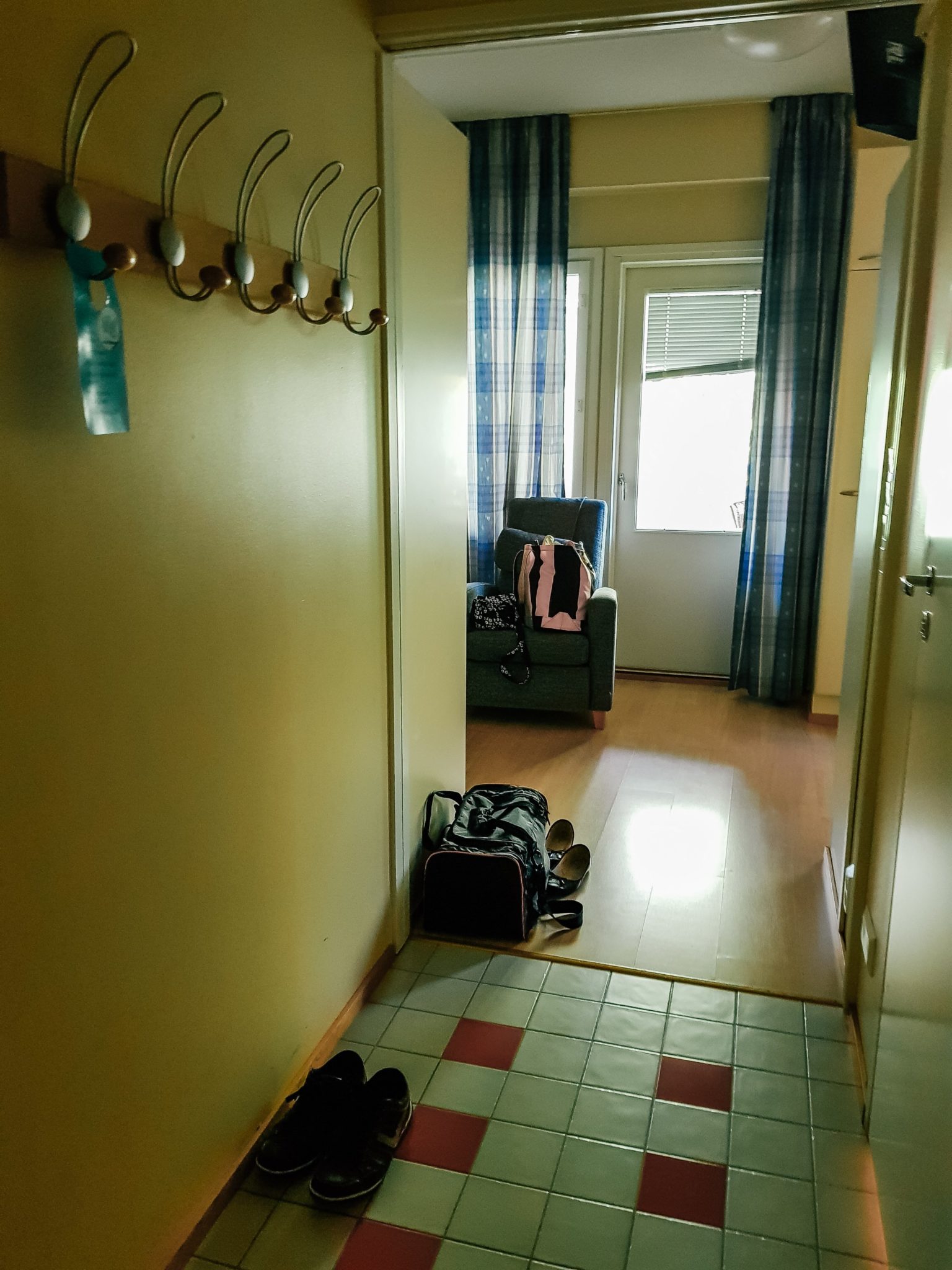 Huoneistohotellin huoneessa oli mikro, kahvinkeitin, aterimet ja pieni tiskiallas, joten siellä olisi voinut hyvin asua pidempiäkin pätkiä ja tällainen on varmaan suosittu vaihtoehto työmatkalaisille. Sain Instagramissa viestiä, että heillä oli ollut todella huonot sängyt huoneessa, mutta meille kyllä oli valikoitunut ihan mukavat sängyt. Itsehän testasin niistä kahta, kun alkuyön nukuin yksin ja loppuyön Vivian vieressä. Tyynyjäkin oli lisää kaapeissa, jos kaipasi enemmän kuin yhtä tyynyä nukkumiseen.