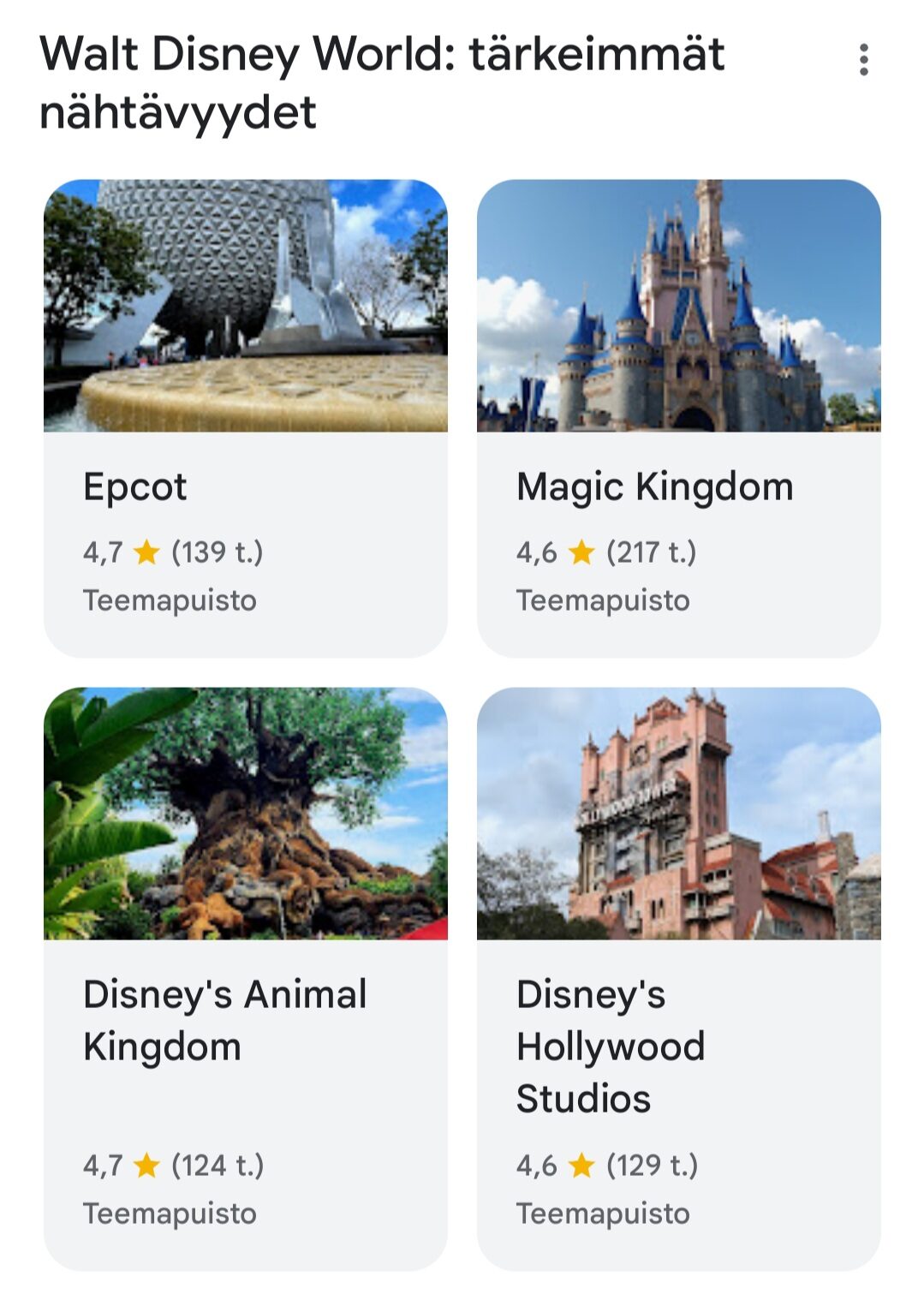 Naureskelin yksi päivä, kun tajusin mun uudehkon puhelimen jo selvästi tuntevan minut. Olen ehkä puhunut tai kirjoittanut sanan Disneyland tai Disney liian monesti, että puhelimenikin jo ehdottelee minulle matkaa Disneyn puistoon. Jos raha ei olisi este, minne matkustaisin? No tietysti Walt Disney Worldiin, joka sijaitsee Orlandossa.