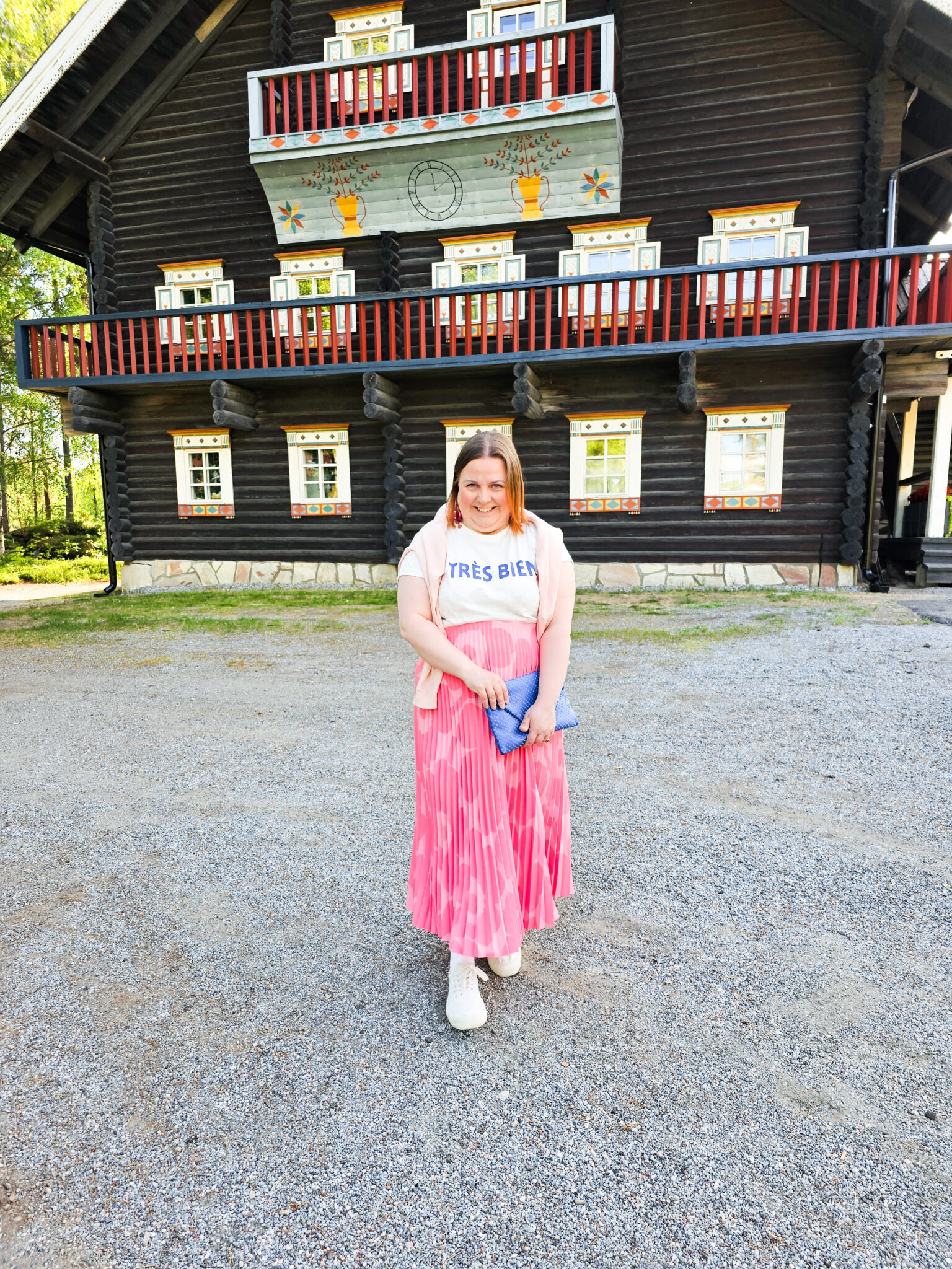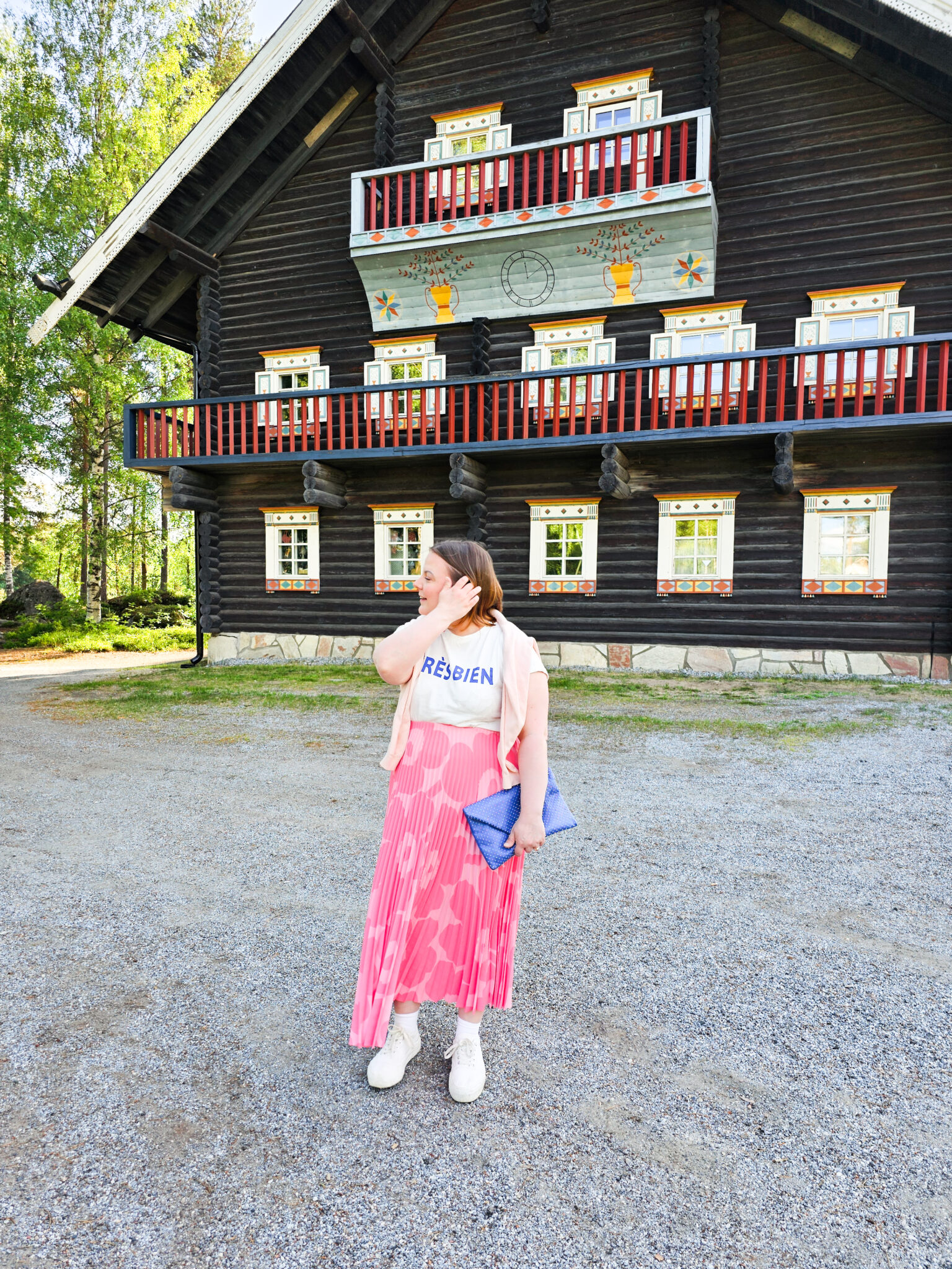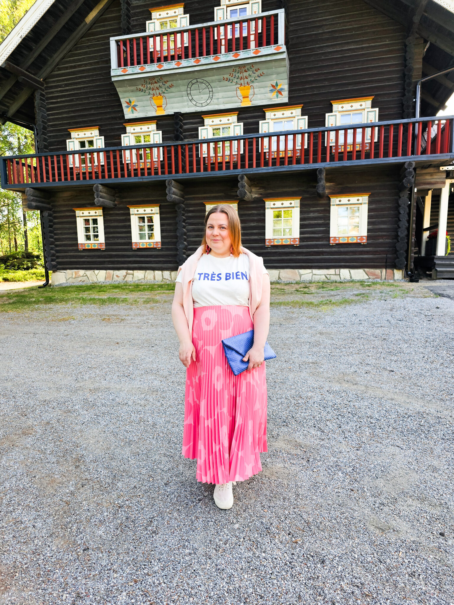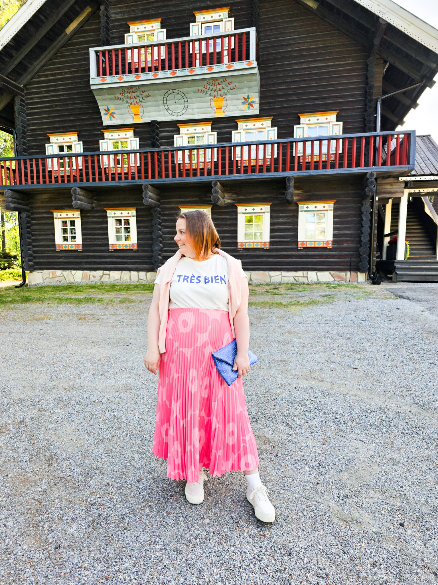 Hame tuntuu nostaessa tosi raskaalta ja pelkäsin vähän sen tuntuvan päälläkin siltä, mutta päällä se on ihanan kevyt ja liikkuvainen. Yhdistin hameen t-paitaan ja neuleeseen sekä tennareihin, kun käytiin Bomballa syömässä juhannuksena. Juhliin tämä menisi helposti, kun yhdistäisi sen erilaisiin kenkiin ja yläosaan.