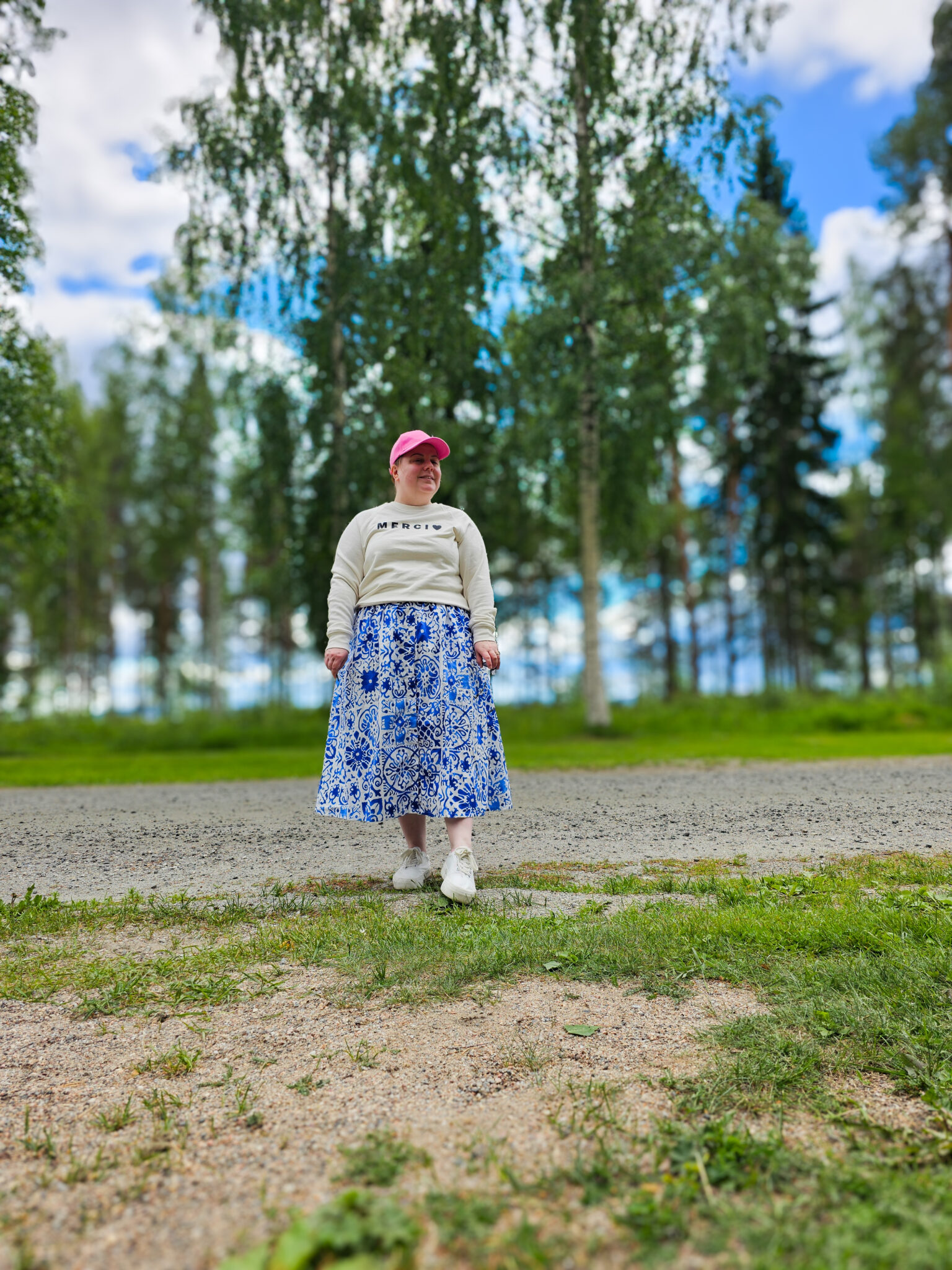 Mun kesän yhdeksi luottovaatteeksi on muodostunut selvästi Lindexin sinivalkoinen hame, jonka ostin keväällä. Juhannuksena mulla olikin päällä tämä sinivalkoinen asu ripauksella pinkkiä, kun yhdistin hameeseen collegepaidan ja lippiksen sekä tennarit.