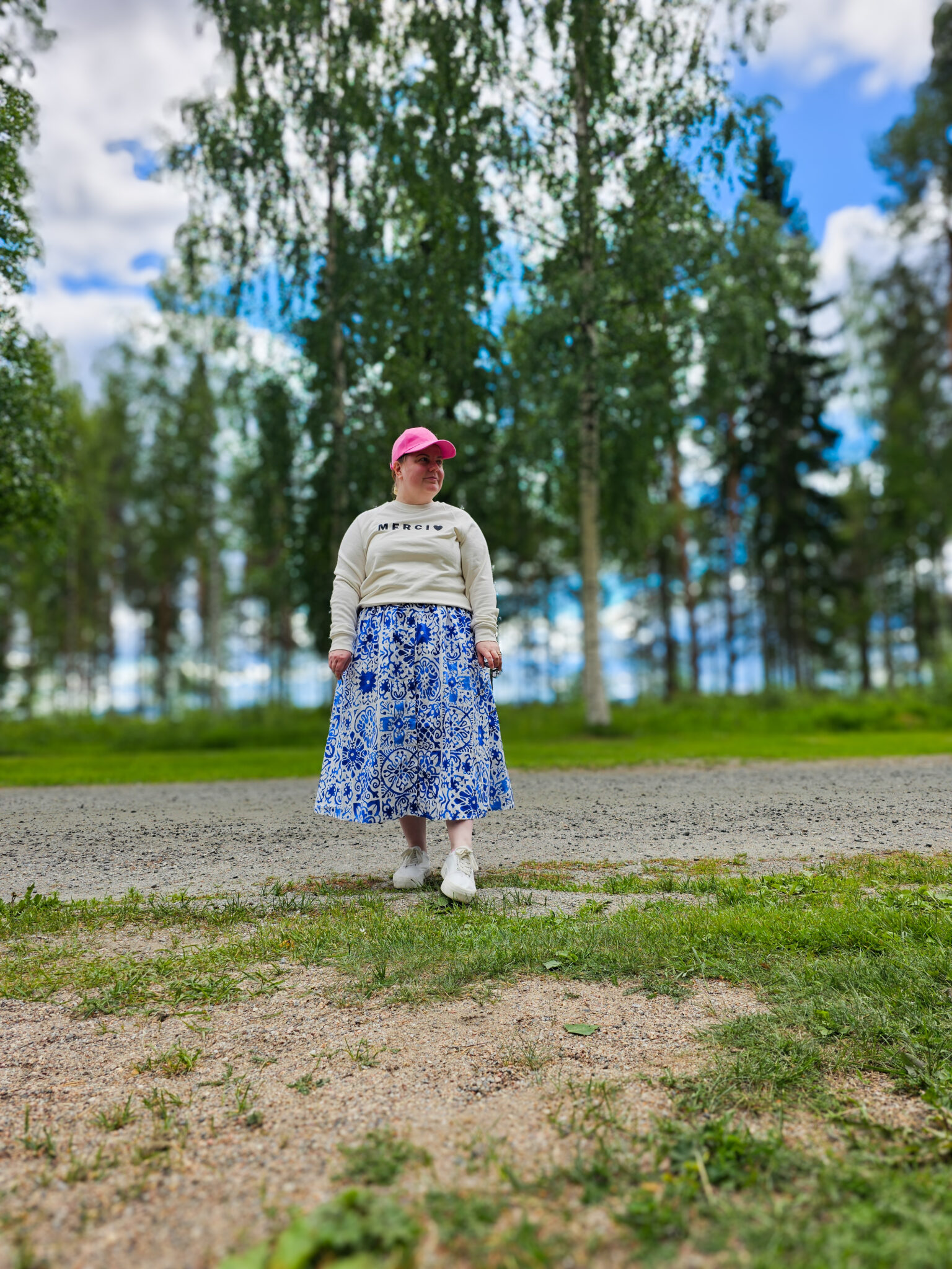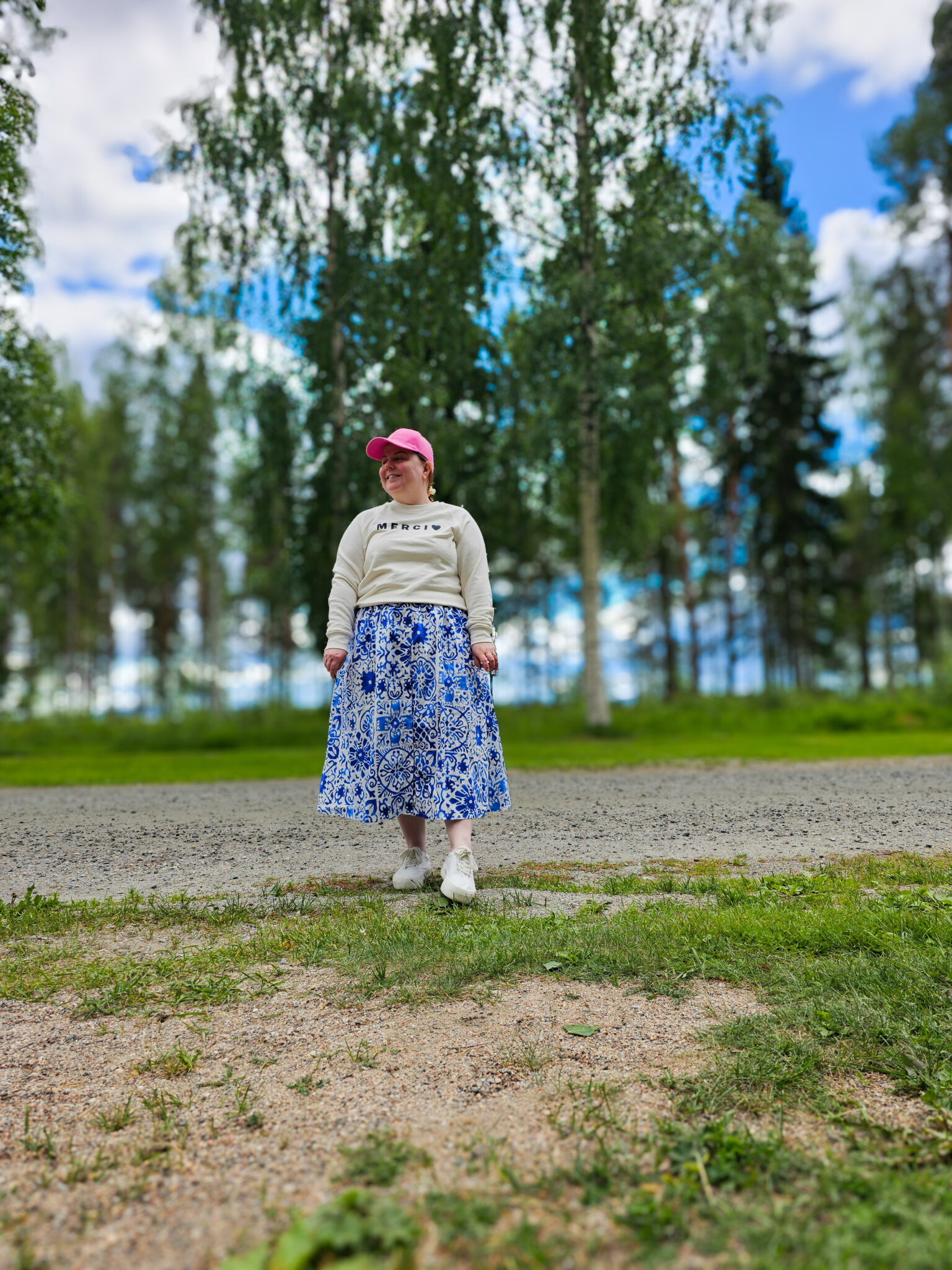 Mun kesän yhdeksi luottovaatteeksi on muodostunut selvästi Lindexin sinivalkoinen hame, jonka ostin keväällä. Juhannuksena mulla olikin päällä tämä sinivalkoinen asu ripauksella pinkkiä, kun yhdistin hameeseen collegepaidan ja lippiksen sekä tennarit.