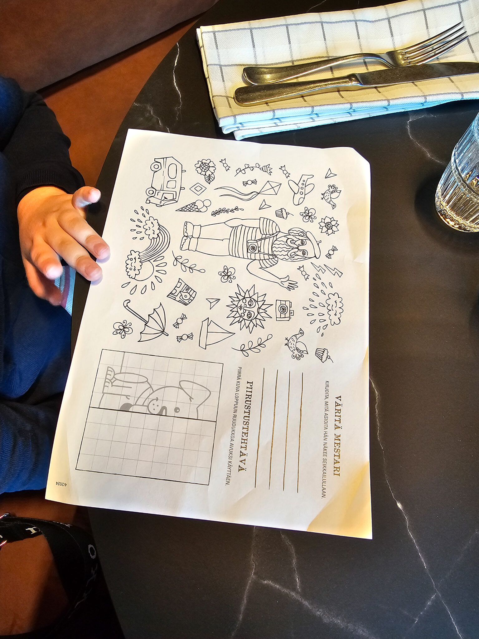 Onneksi hotellin henkilökunta oli aivan todella ihanaa porukkaa ja ottivat lapset vastaan todella kivasti. Ainut miinus avajaispäivänä oli, että värikyniä ei ollut vielä saatavilla (olivat jääneet jumiin matkalle) ja lastenlistan takana olevaa värityskuvaa ei siis päässyt värittämään. Onneksi ihana tarjoilija tarjoitui kuitenkin antamaan lapsellemme mustekynän ja harmitus oli tiessään.