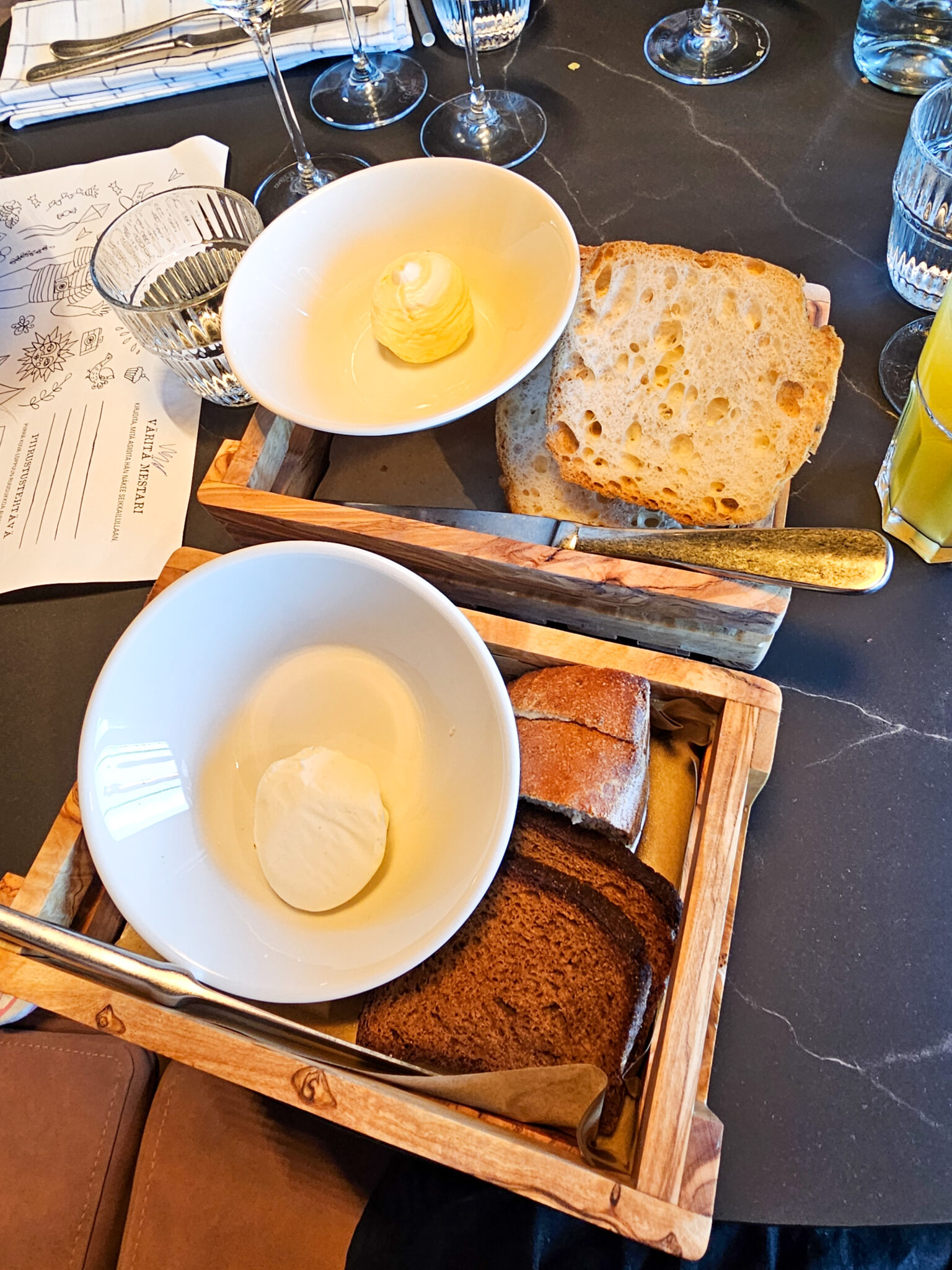 Lapsetkin jaksoivat ihmeen hyvin koko aterian. Vähän 7-vuotiaalla meinasi tylsyys iskeä välillä, mutta oltiin kovana eikä annettu hänelle puhelinta tällä kertaa käteen. Päätettiinkin, että yritetään käydä lasten kanssa useammin ravintolassa, että he oppivat maistelemaan uusia juttuja ja kärsivällisesti odottamaan ruokaa.