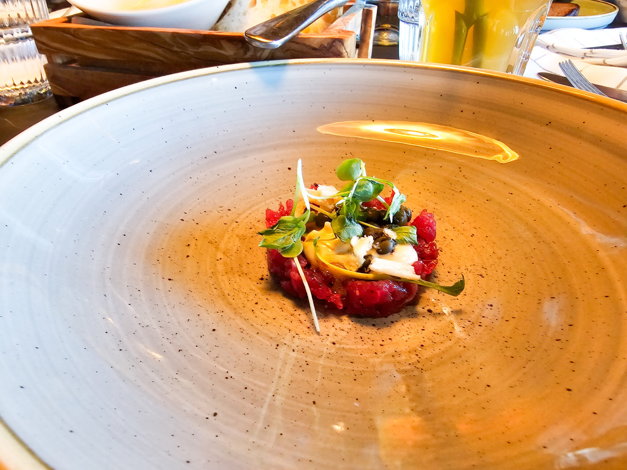 Itse en lohikeittoa kala-allergisena tietenkään tilannut. Tilasin tartar-pihvin, joka oli yllättävän hyvää. Olin hieman skeptinen tämän suhteen, mutta listalla ei ollut muuta minulle gluteenittomana ja kala-allergisena sopivaa alkuruokaa, joten tilasin tämän ja yllätyin positiivisesti.