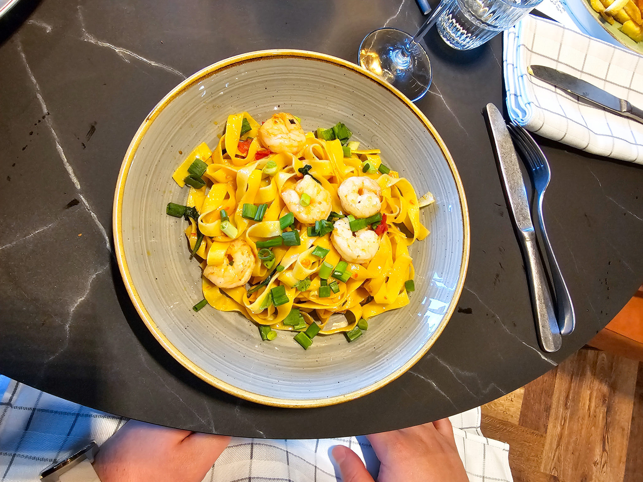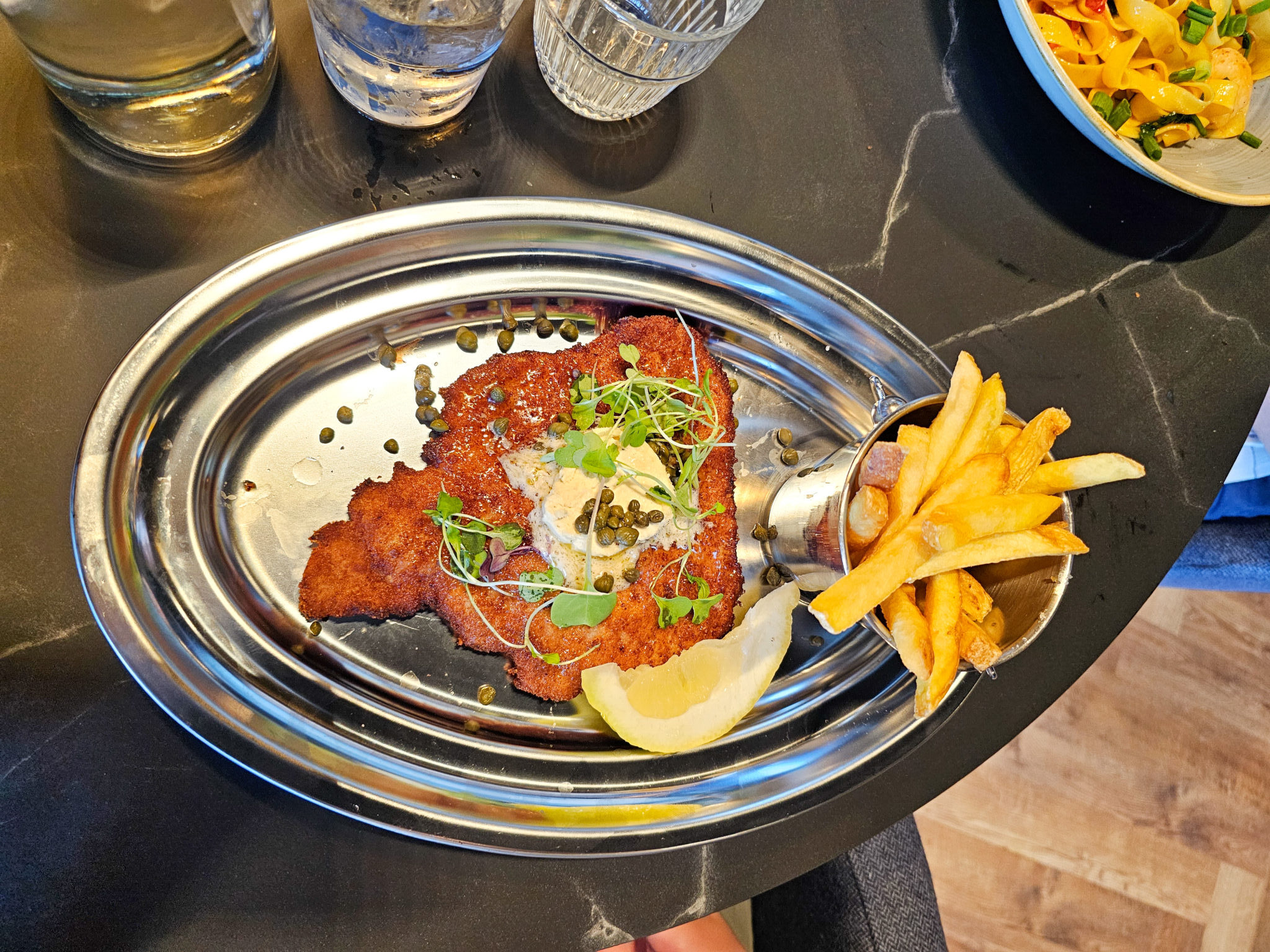 Jani tilasi katkarapupastan ja tykkäsi annoksesta niin paljon, että alkoi miettiä miksei useamminkin tilaa ravintolassa pastaa. 12-vuotias tilasi Bistron leikkeen (joka muuten oli gluteeniton vaikka oli leivitetty ja itsekin mietin tämän tilaamista ensin). Hän myös tykkäsi ruoastaan ihan todella paljon.