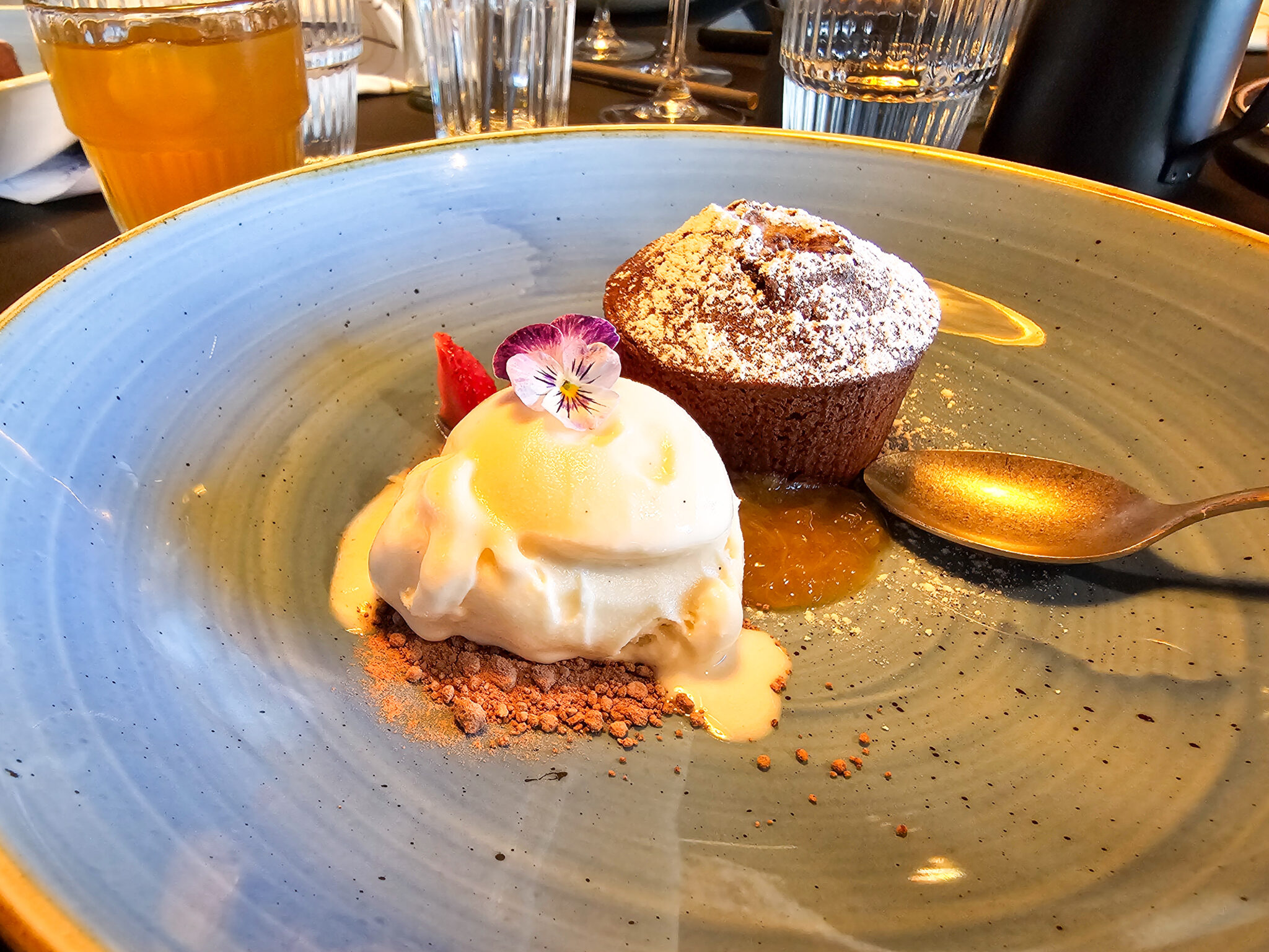 Jälkiruoaksi kaikki muut paitsi 12-vuotias tilattiin lämmintä suklaakakkua raparperihillokkeella, marinoidulla mansikalla ja vaniljajäätelöllä. Minä ja 7-vuotias tosin oltiin niin täynnä jo, että jaksettiin syödä vain puolet jälkkäreistä ja loppu pöytäseurue söi meidän jälkkärit loppuun. Annos oli gluteeniton, josta iso plussa. Maku oli taivaallinen.