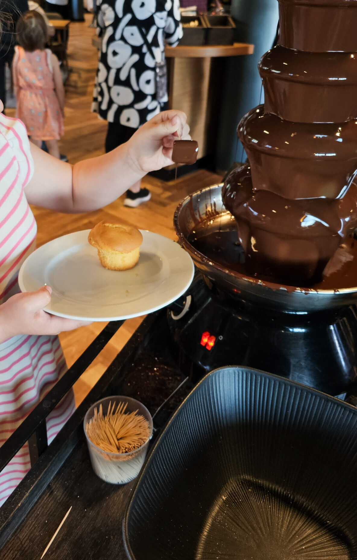 Aamiaisen paras juttu meidän lasten mielestä oli ehdottomasti suklaaputous, johon sai dipata vaahtokarkkeja. Toinen 12-vuotiaan ja Janin suosikki oli mehukoneesta löytynyt mustikkamehu. Jani myös arvosti kovasti aitoja karjalanpiirakoita.