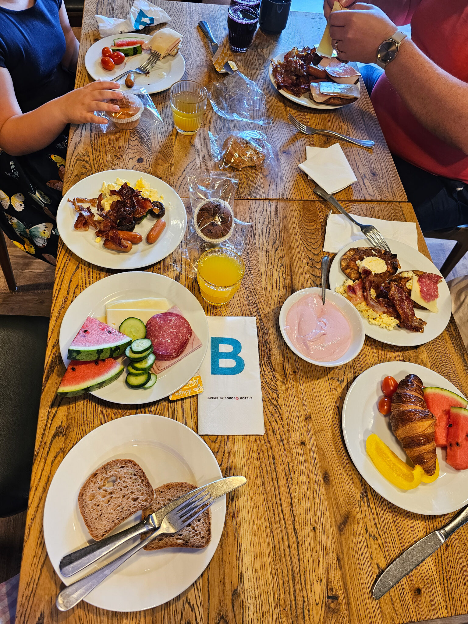 Hotelli oli aivan täynnä ja me oltiin molempina aamuina liikkeellä just pahimpaan ruuhka-aikaan. Mikään tarjolla oleva asia ei kuitenkaan loppunut missään vaiheessa kesken, vaikka joitain asioita joutui hetken odottamaan.