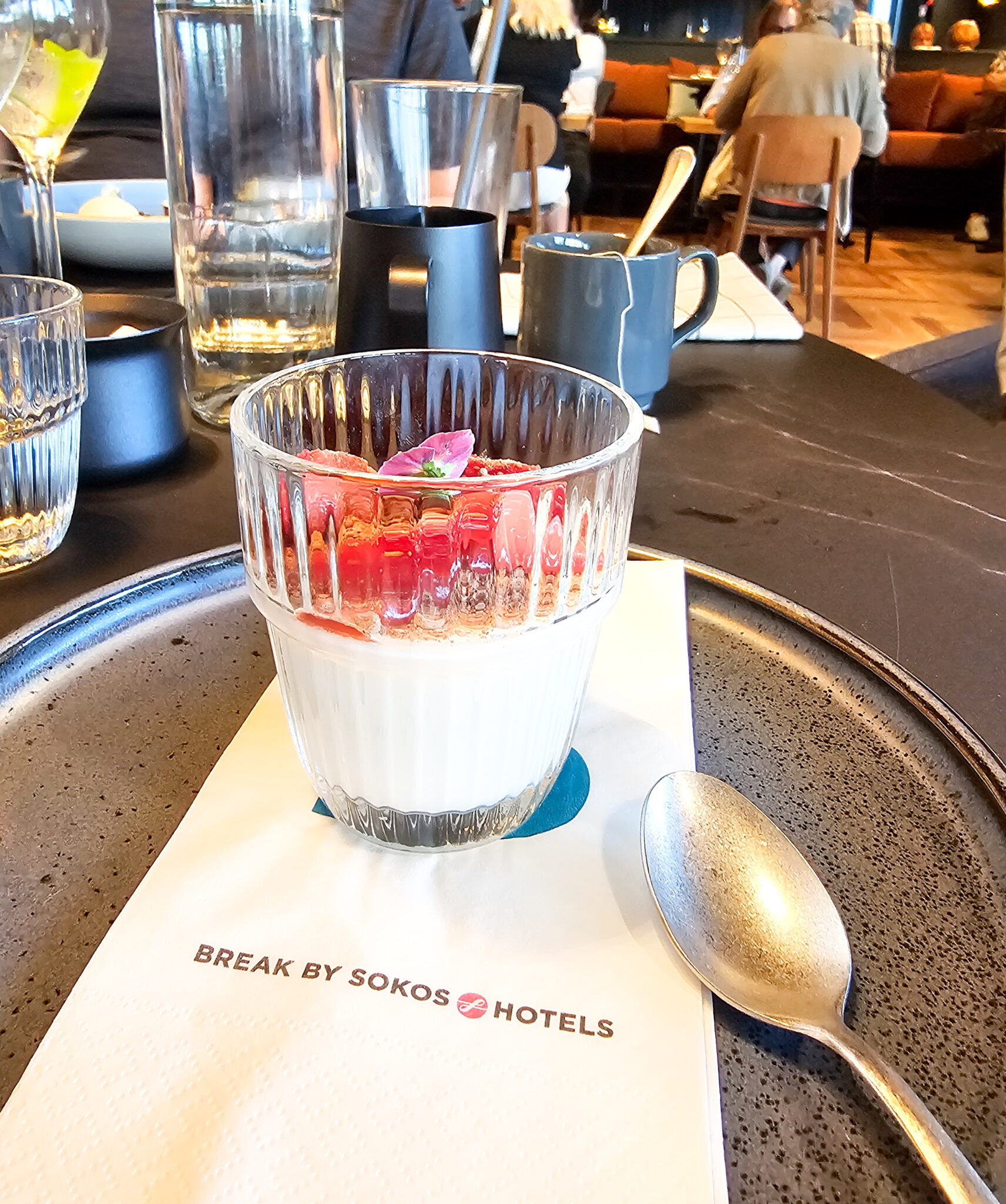 12-vuotias tilasi pitkän pohdinnan jälkeen sitruunaposset-annoksen marinoidulla mansikalla ja kristallisuklaalla ja oli oikein tyytyväinen valintaansa. Meidän tarjoilijan lemppari oli kuulemma kolmas jälkiruoka, joka olisi ollut marenkia ja mascarponevaahtoa hedelmillä, mutta kukaan meistä ei maistanut sitä tällä kertaa.