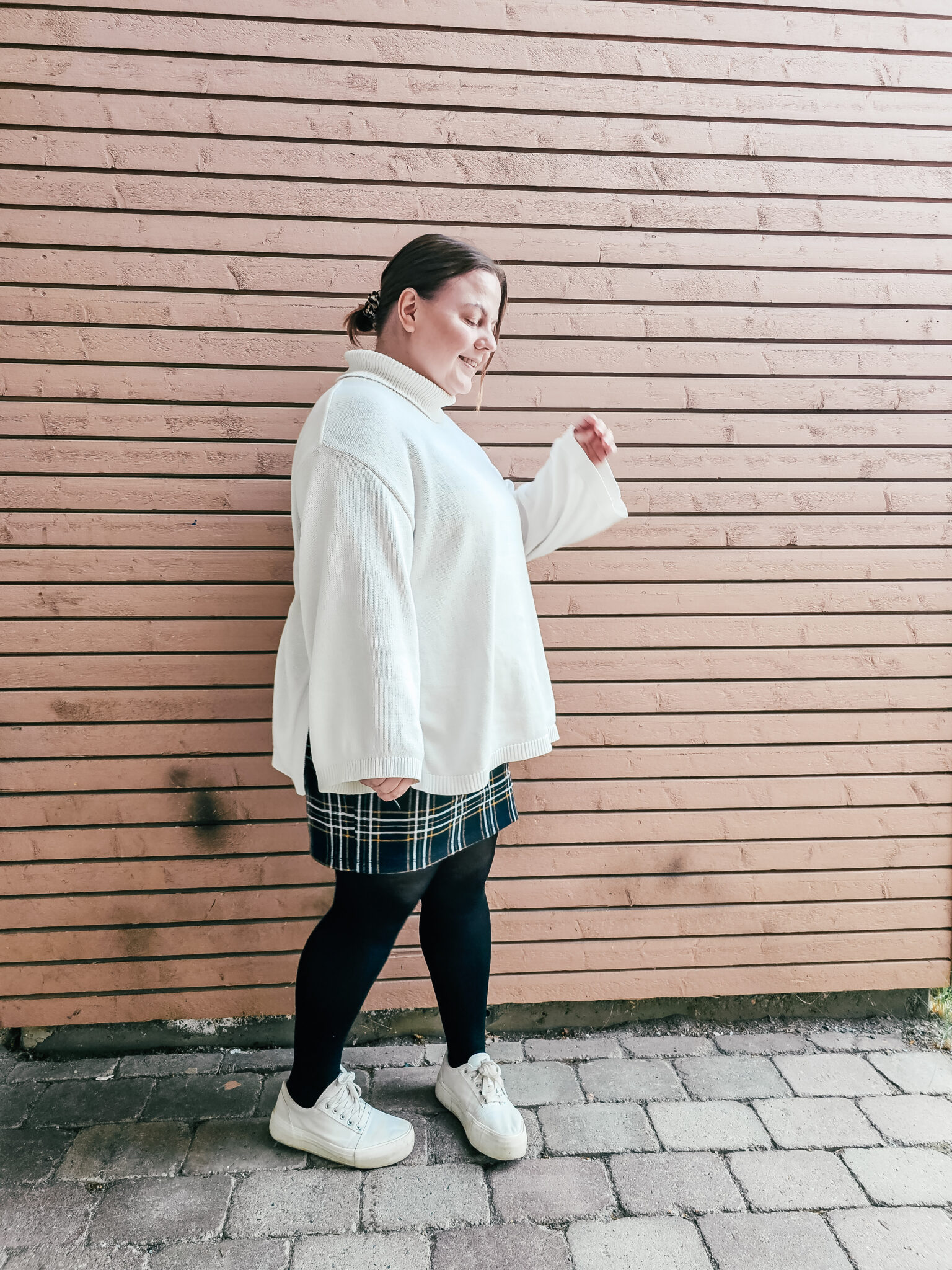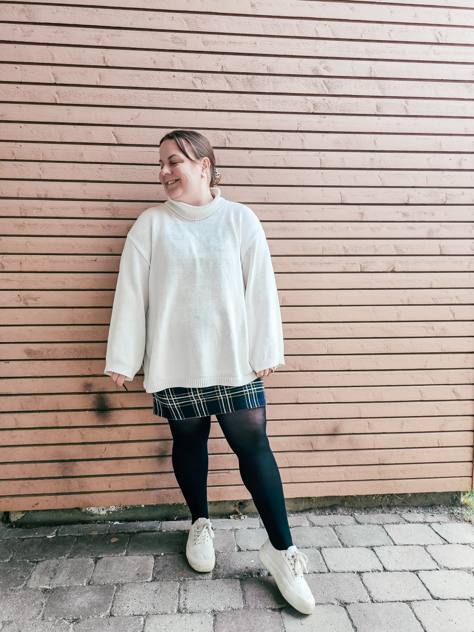 Oon oottanut koko kesän, että pääsen pitämään sukkahousuja, minihameita ja neuleita, koska en oikein osaa pitää minihametta ilman sukkahousuja. Muuten pidän hameen aina lyhyitä pyöräilyshortseja, mutta minihameiden kanssa se ei tunnu vaan kivalta.