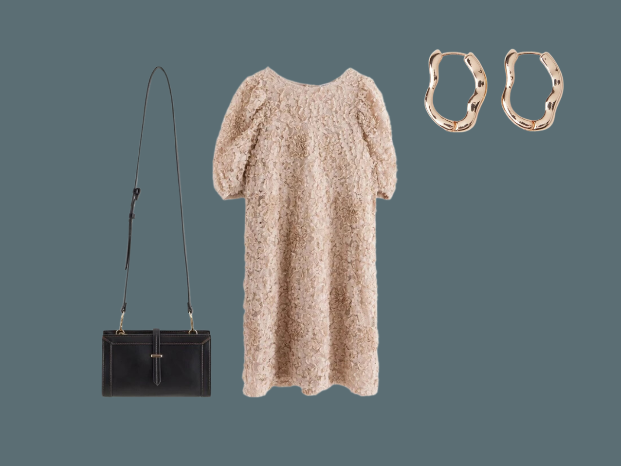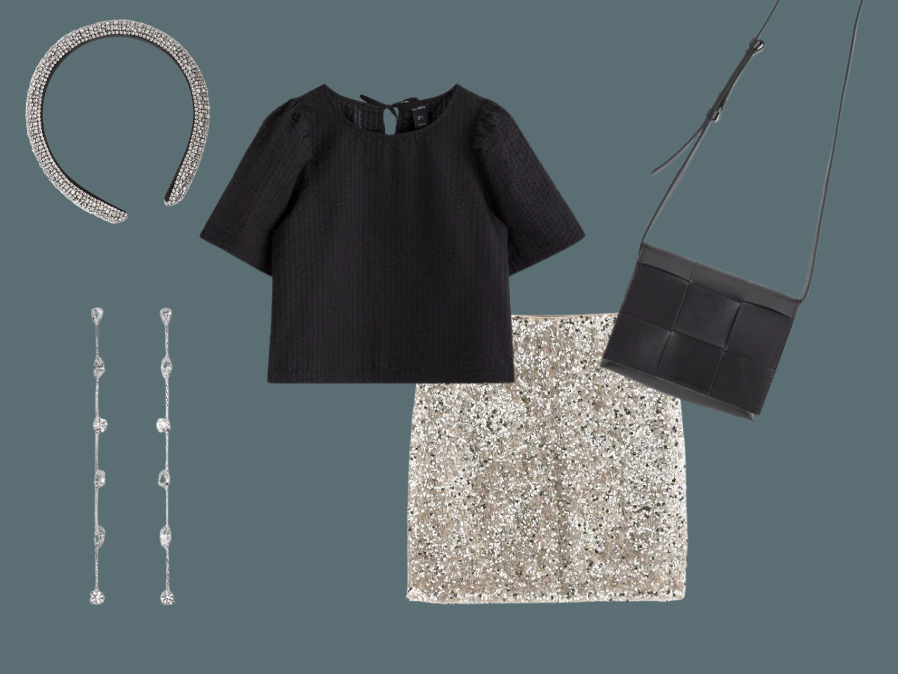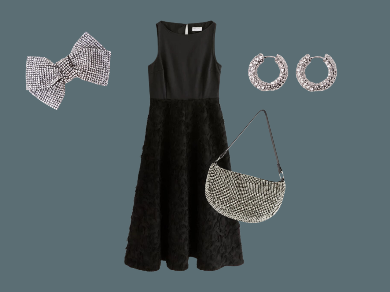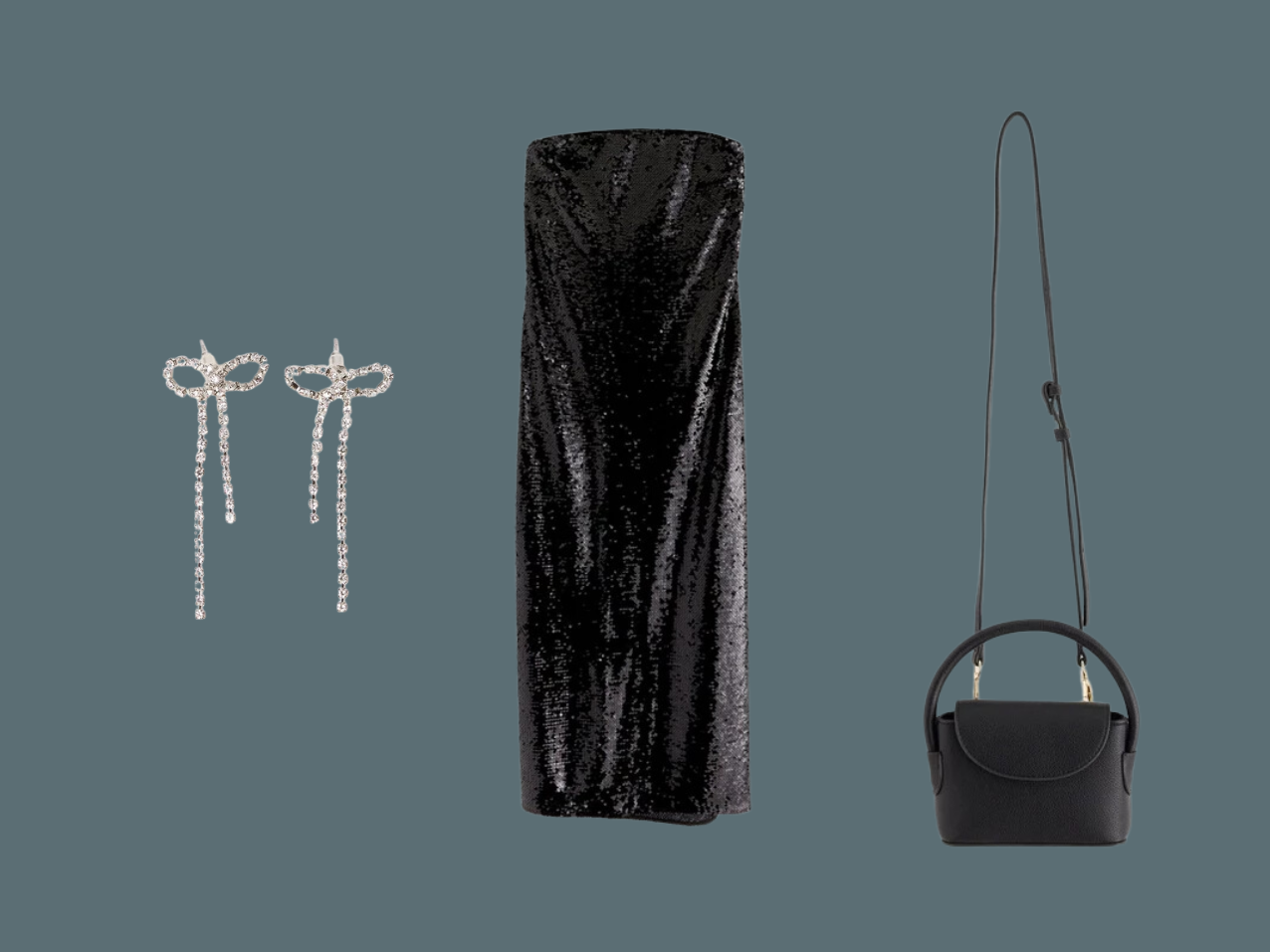 *Olkaimeton paljettimekko | *Korvakorut | *Laukku
