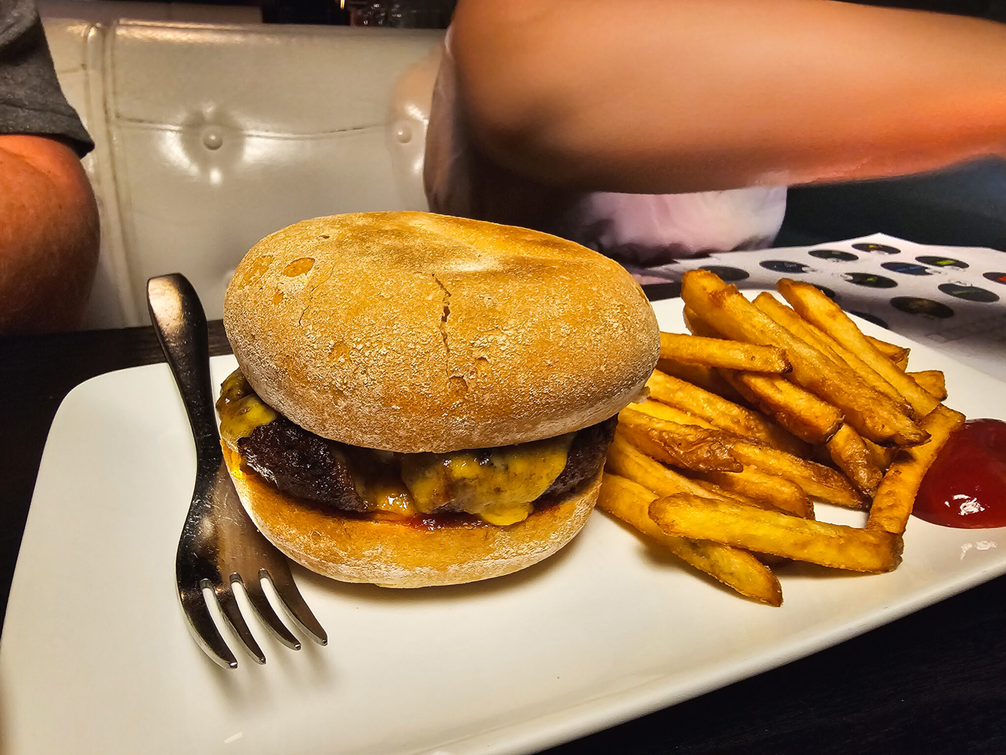 Käytiin testaamassa lounaan myös kesällä lasten kanssa. Lasten annokset oli pienempiä kuin aikuisten, mutta hyvin täyttyi vatsat ja mulle itselleni tuo normaali lounasannos on aika iso. Lounaalla hampurilaisen kylkeen tulee ranskalaiset, kun iltaisin sekä hampurilainen että ranskalaiset tilataan erikseen.