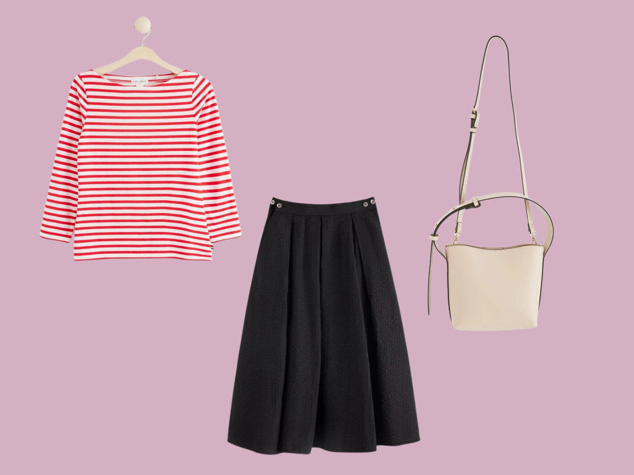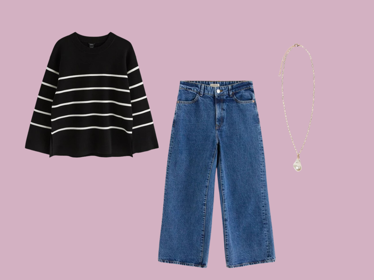 *Pusero | *Collegeliivi | *Leveälahkeiset housut | *Laukku