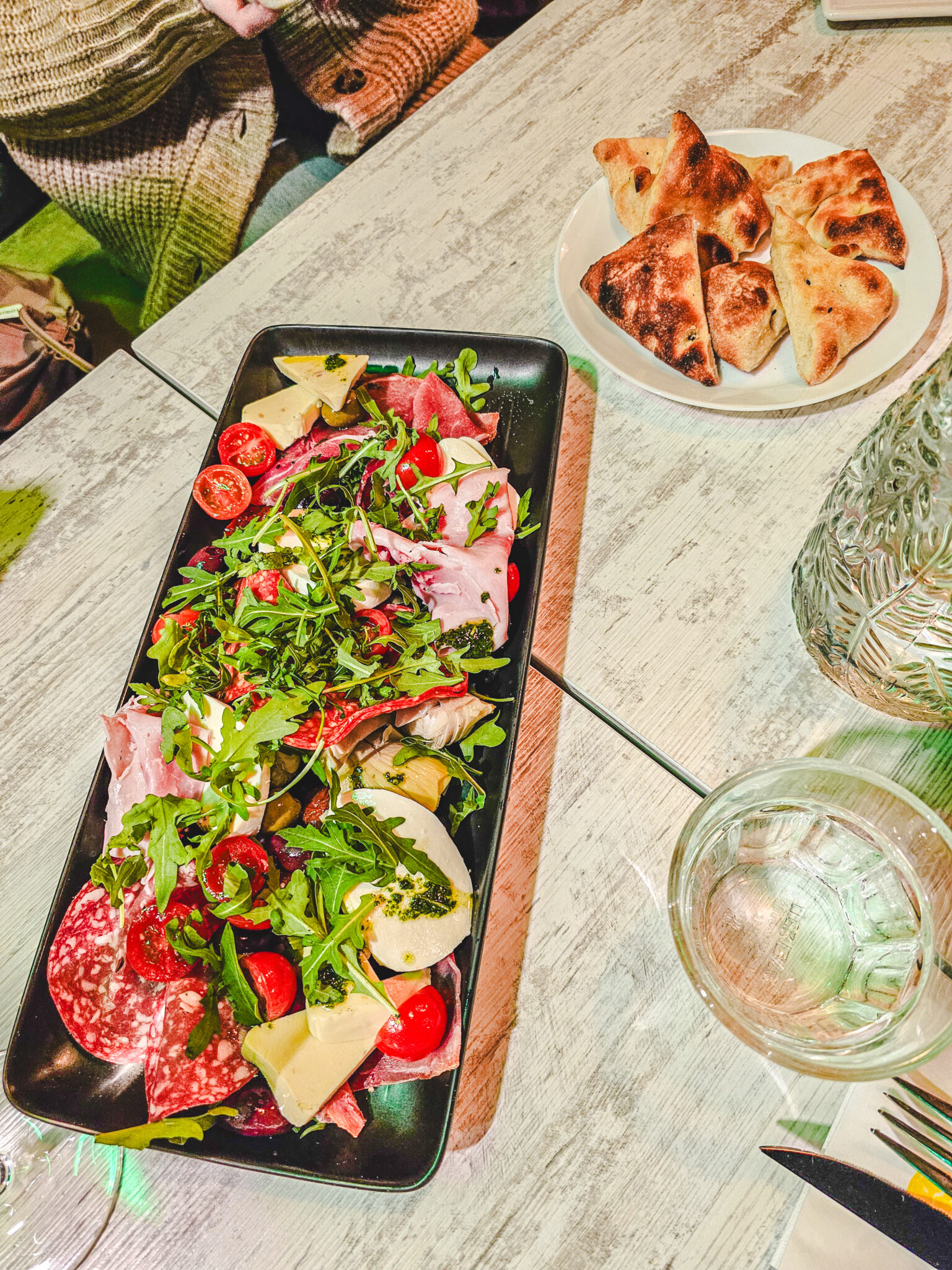 Tilattiin alkuun yhteinen antipastolautanen, koska oltiin niin nälkäisiä ja otettiin kyytipojaksi kaikki valkoviiniä. Tilattiin suoraan karahvi, koska hintaero kolmeen lasilliseen oli aika mitätön. Antipastolautasen kanssa tuotiin pöytään leipää. Gluteenitonta leipää ei ollut tarjolla.
