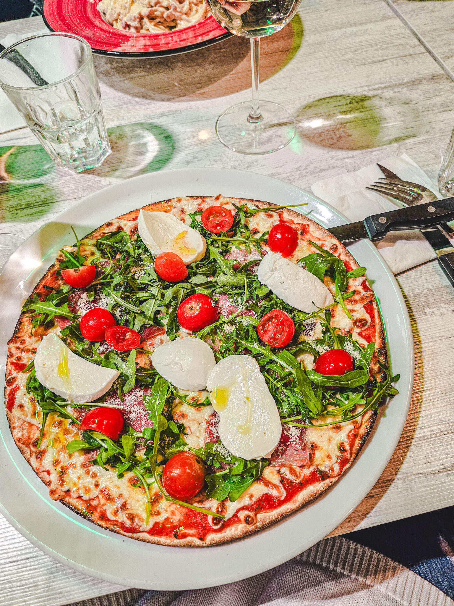 Valintani oli Pizza di Parma, jossa oli täytteenä tomaattikastike, mozzarella, rucola, kirsikkatomaatti, buffalo mozzarella, parmigiano reggiano, neitsyt oliiviöljy. Pizza oli todella hyvä, mutta jaksoin syödä siitä vain noin puolet. Onneksi sain loput mukaan, kun pyysin ja söinkin pizzaa sitten myös iltapalaksi.