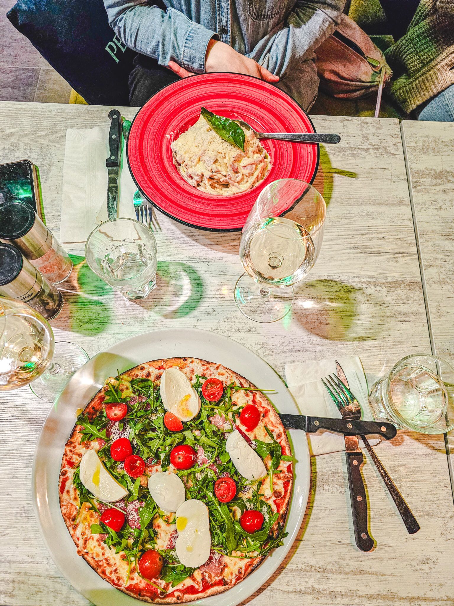Minä tilasin pizzaa, koska sitä sai gluteenittomana. Mietin ensin risottoa, mutta siitä oli vain kaksi kasvisannosta eikä mieleni tuolloin tehnyt sellaista.