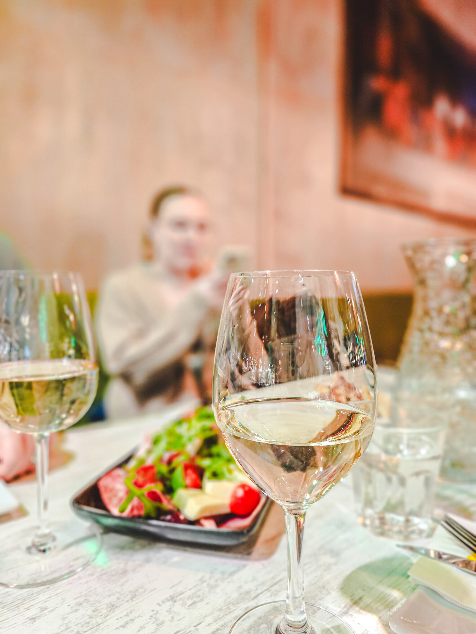 Tilattiin alkuun yhteinen antipastolautanen, koska oltiin niin nälkäisiä ja otettiin kyytipojaksi kaikki valkoviiniä. Tilattiin suoraan karahvi, koska hintaero kolmeen lasilliseen oli aika mitätön. Antipastolautasen kanssa tuotiin pöytään leipää. Gluteenitonta leipää ei ollut tarjolla.