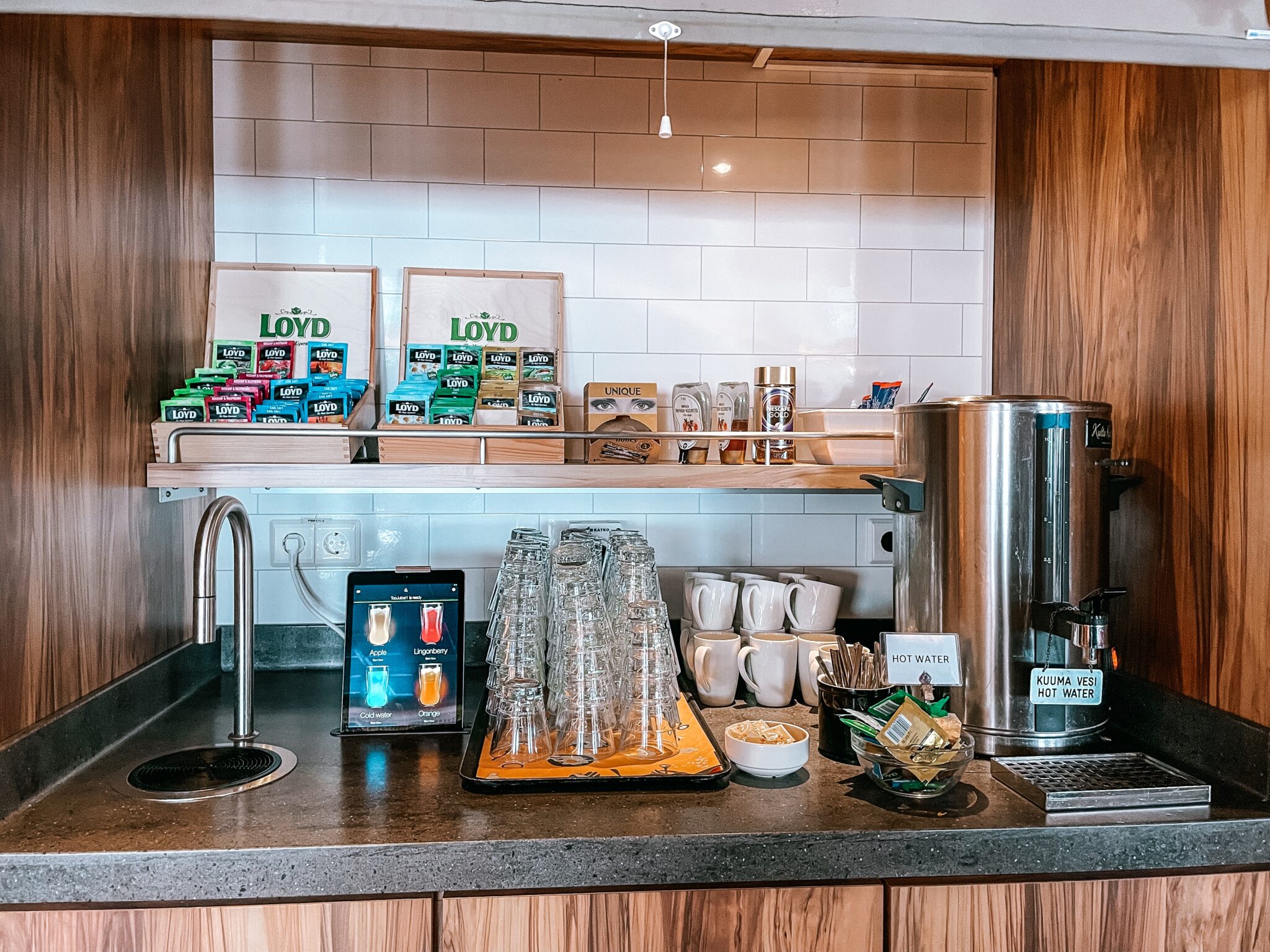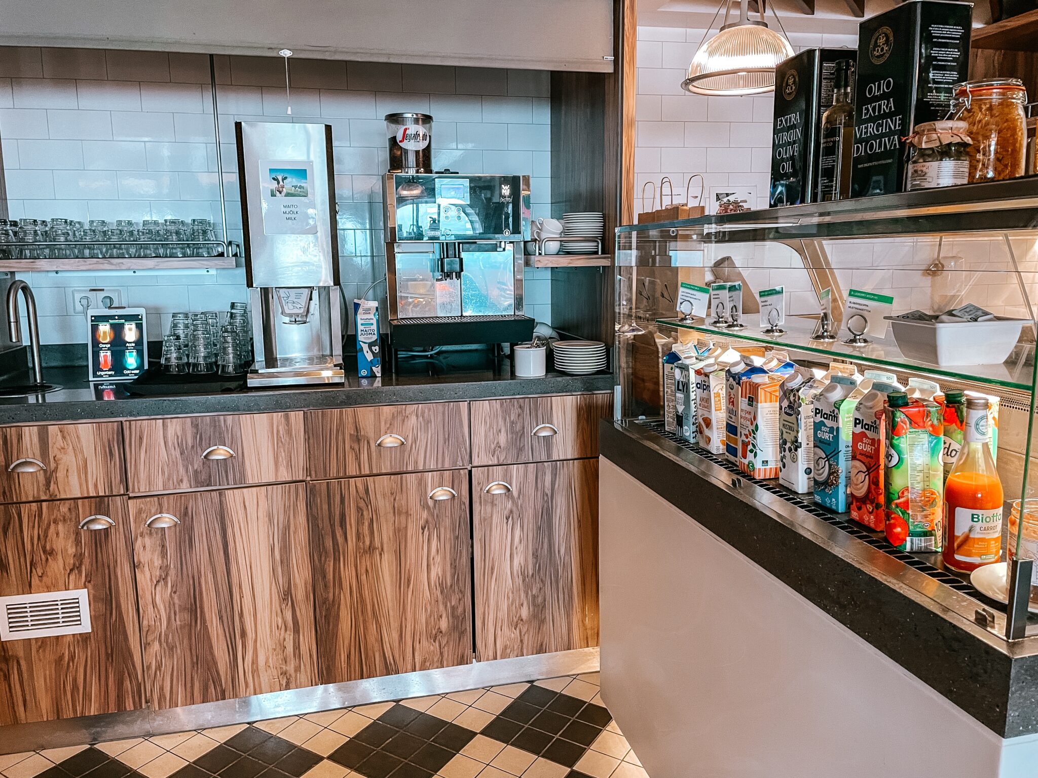 Erikoisaamiaisen hintaan kuuluu kuohuviinilasillinen ja lapsille lasten kuohujuoma. Itse en kuohuviinistä välitä, joten en sitä yleensä ota. Kahvi tarjoillaan pöytiin.