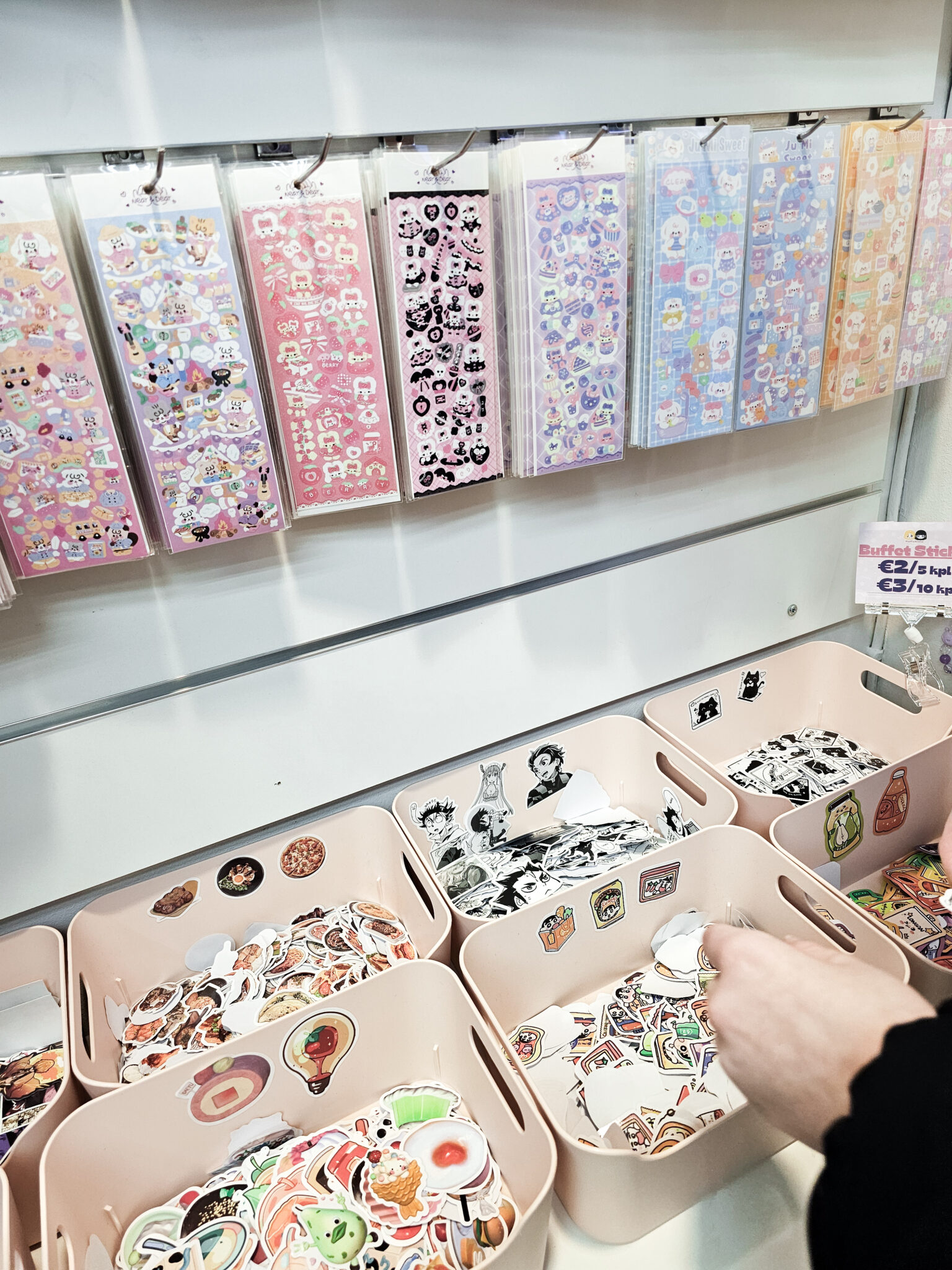 Tämän jälkeen palasimme keskustaan, jossa tapasimme esikoisen. Olin nähnyt Tiktokissa videopätkiä söpöstä Karis’s shop -myymälästä Hakaniemessä, joten lähdimme sinne ratikalla. Lapset ostivat tarroja, jonka jälkeen palasimme keskustaan.