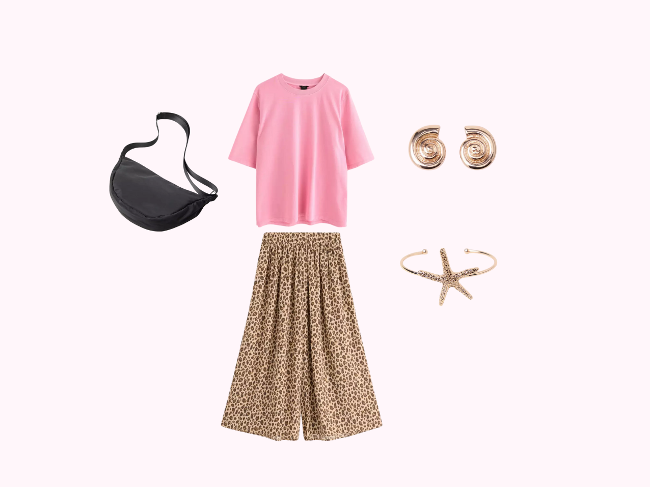 *OVERSIZE T-PAITA | *LEOPARDIKUVIOLLISET HOUSUT | *KORVAKORUT | *MERITÄHTIRANNEKORU | *OLKALAUKKU