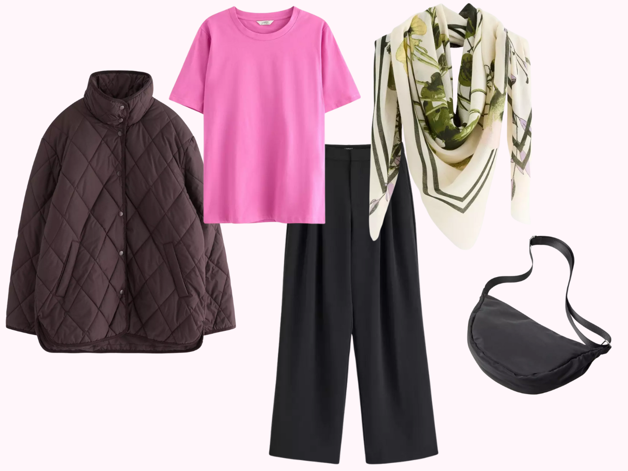 *t-paita | *leveät housut | *vettähylkivä tikattu takki | *huivi | *crossbody olkalaukku |