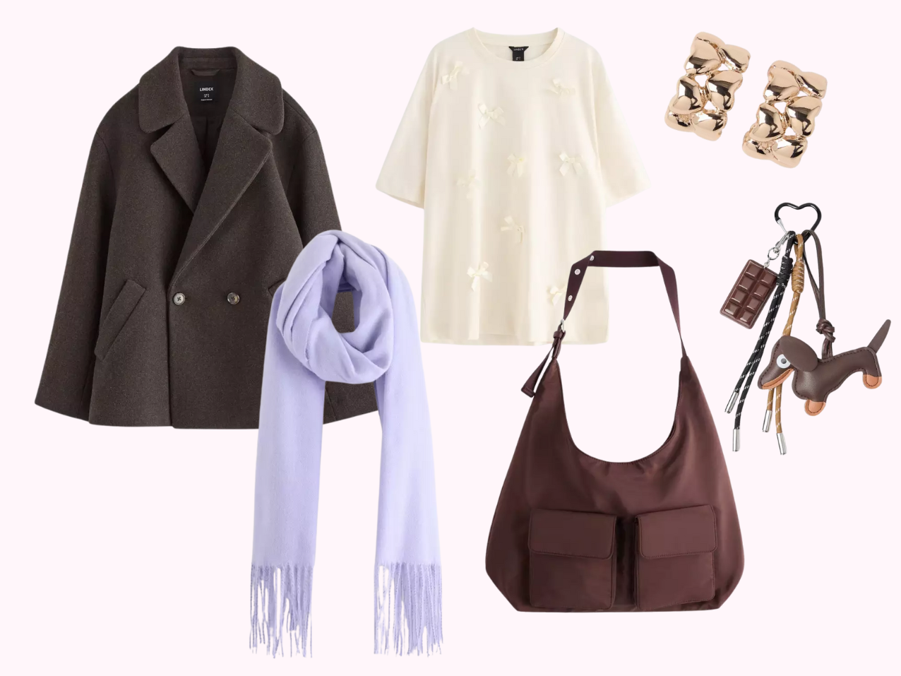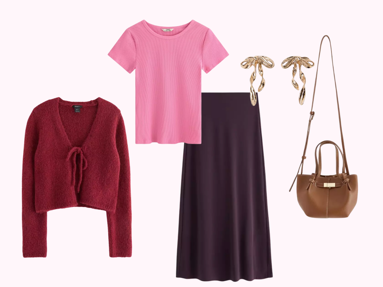 *ribbipaita | *neuletakki | *maksihame | *rusettikorvikset | *keinonahkainen laukku