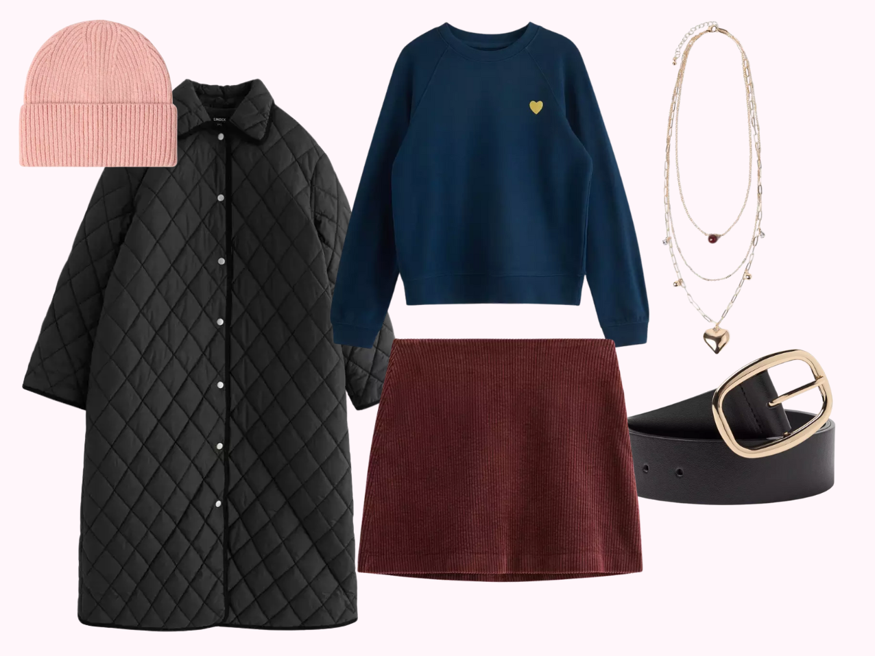 *collegepaita | *vakosamettinen minihame | *tikattu takki | *3 kaulakorua | *neulottu pipo | *tekonahkainen vyö