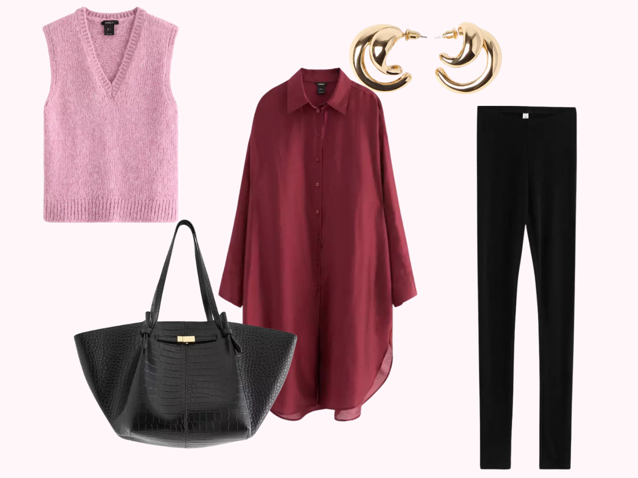 *pitkä paitapusero | *neulottu liivi | *merinovillalegginsit | *korvakorut | *laukku