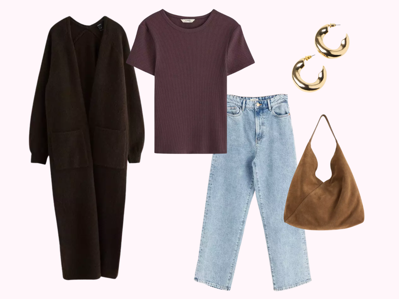*ribattu t-paita | *farkut | *pitkä neuletakki | *laukku | *korvakorut