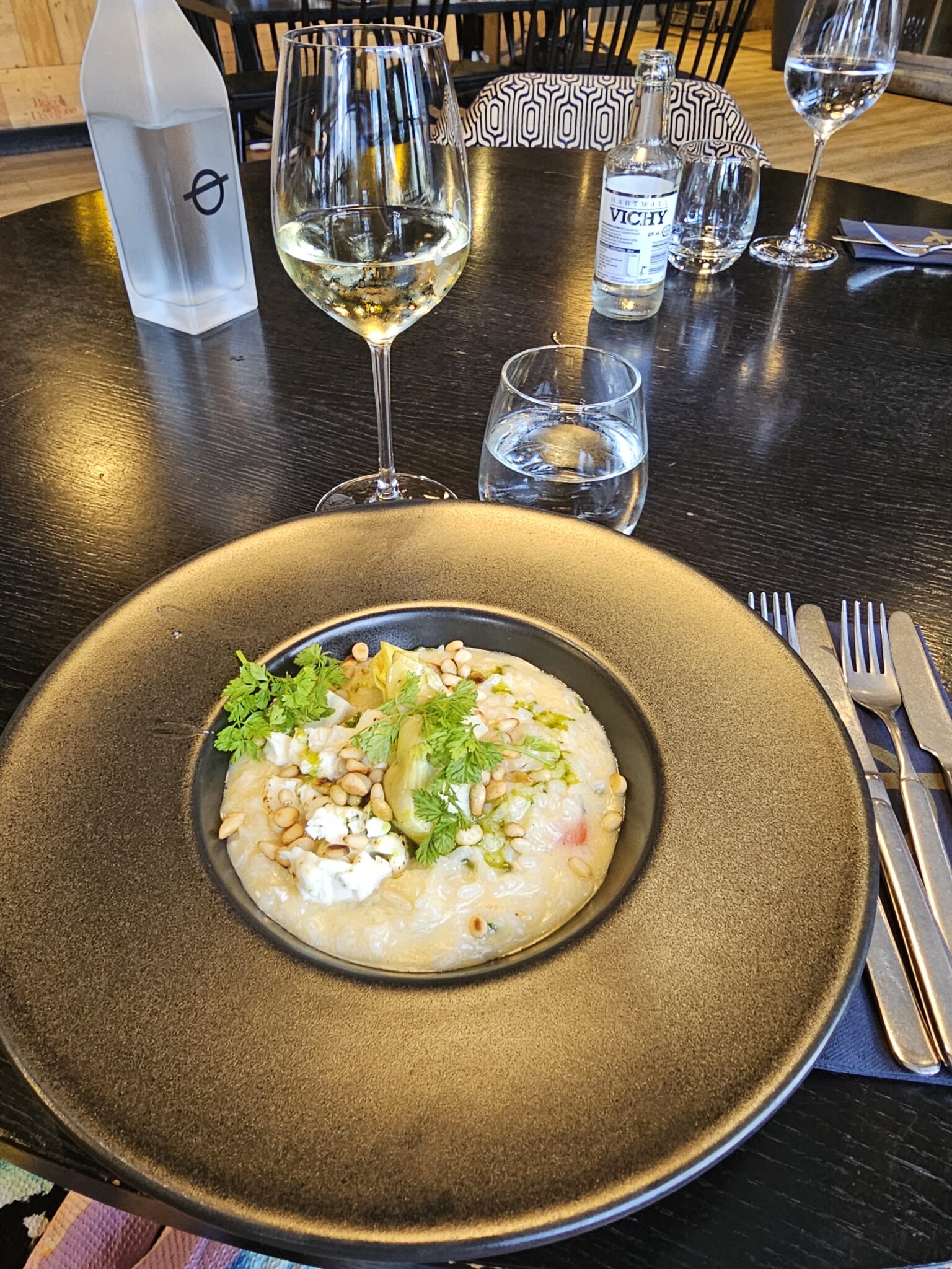 Lisäksi mä tilasin yhden veden ja 12cl valkoviiniä. Mies joi kaksi pulloa vichyä.