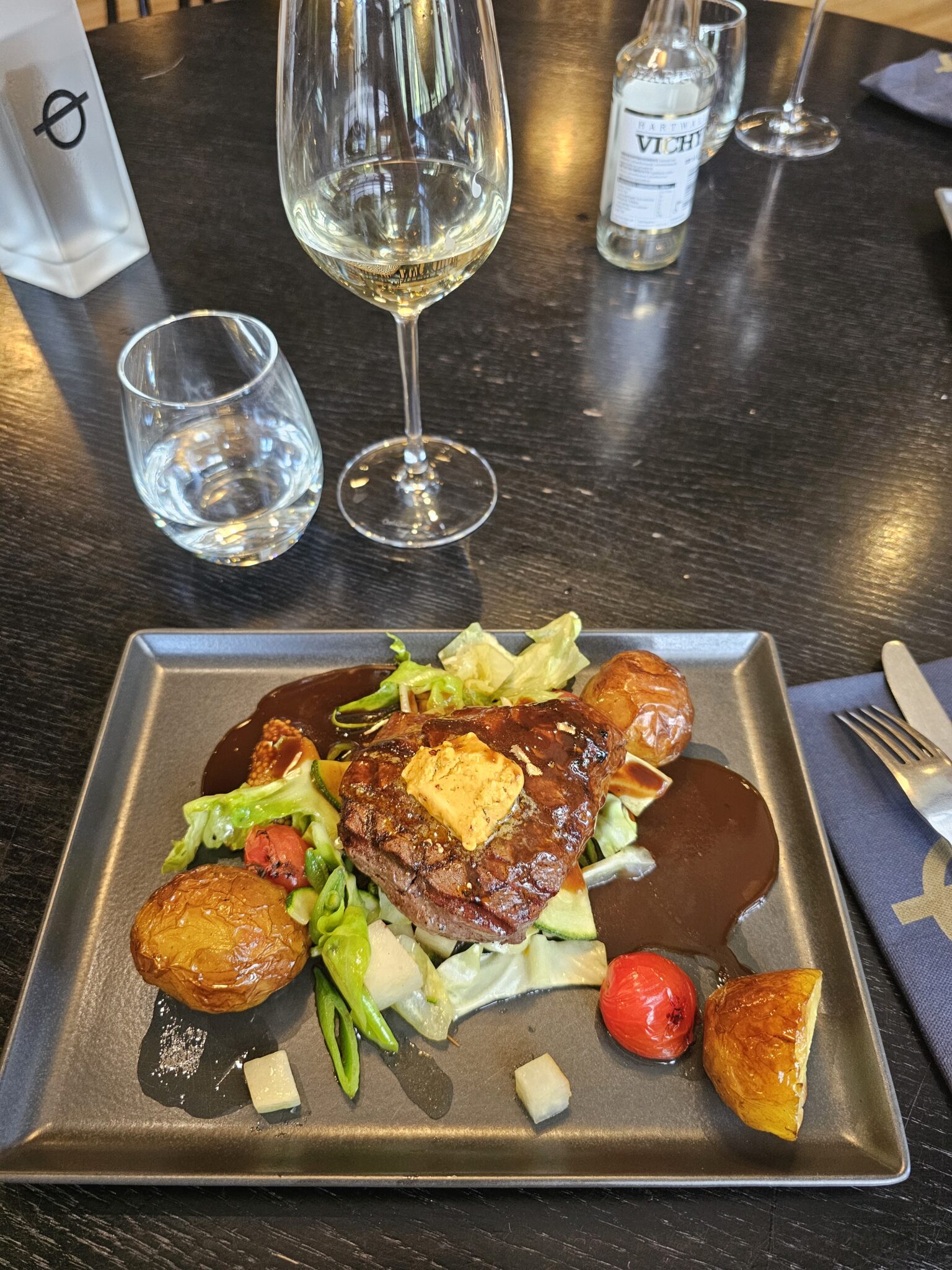 (Hiilikivigrillissä grillattua kotimaista naudan sisäfilettä 180g, pihvivoita, timjamiperunaa, kasviksia ja tummaa sitruunakastiketta)