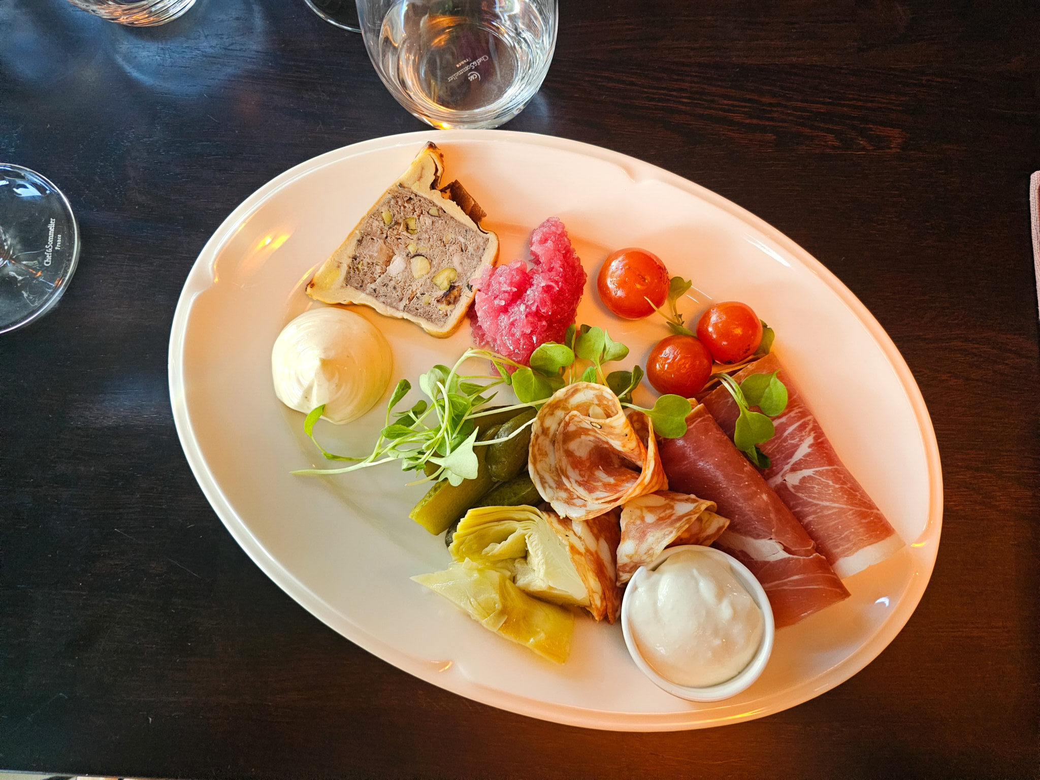 Minä tilasin alkuun La Charcuterie -leikkelelautasen, jossa oli maalaispateeta, ilmakuivattua kinkkua ja salamia. Lisäksi lautasella oli dijonnaisea, pikkelöityjä tomaatteja ja latva-artisokkaa, punasipulimarmeladia sekä cornichons-kurkkuja. Dijonnaise ja maalaispatee oli sellaisia, etteivät ne käyneet minulle allergioiden vuoksi, mutta sanoin, ettei haittaa jos ne on erillään lautasella, koska Jani voi syödä ne.
