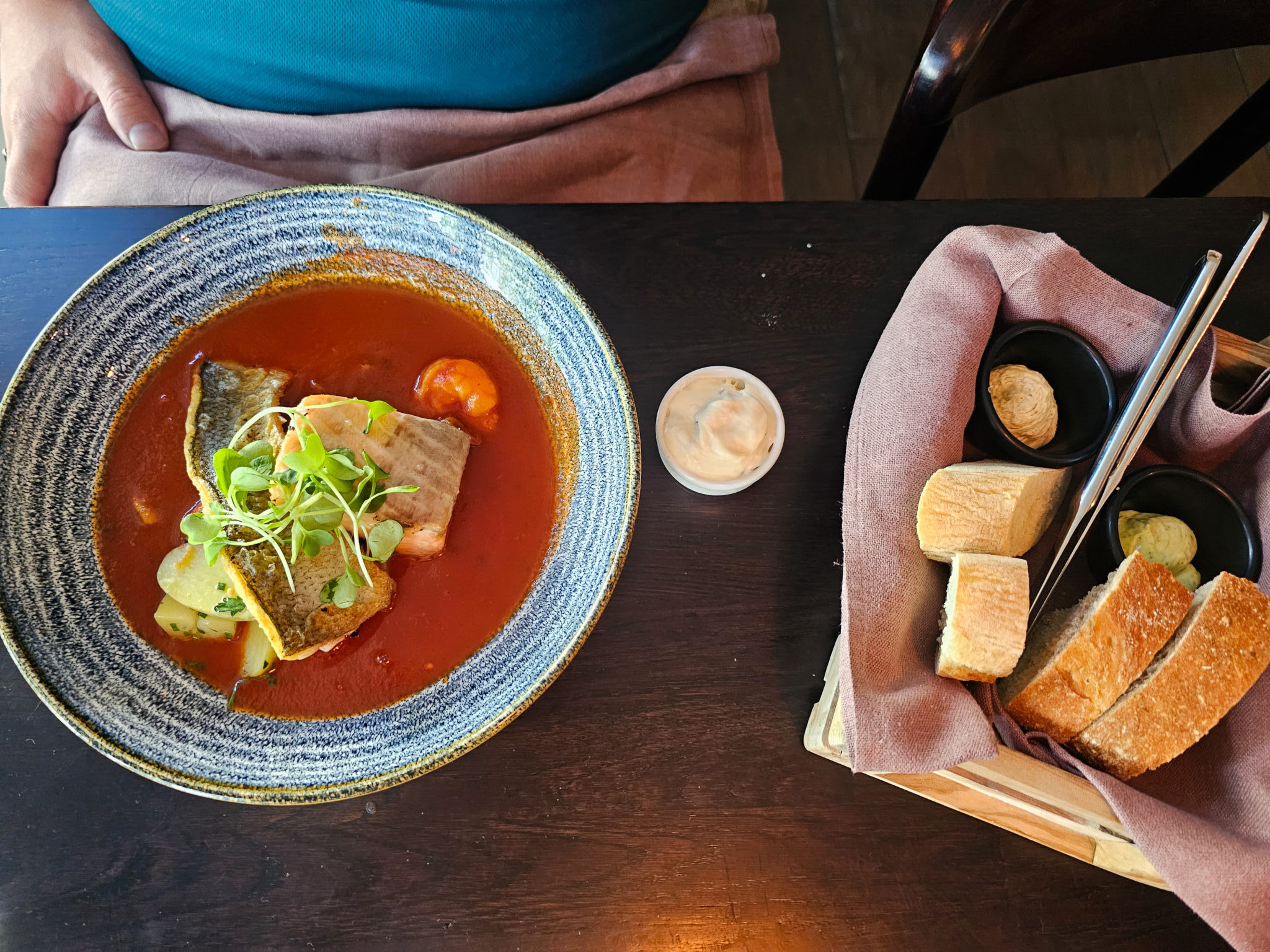 Jani tilasi bouillabaissea. Annos oli siis perinteinen ranskalainen kalapata: lohta, siikaa, sinisimpukoita, jättiravunpyrstöjä, tomaattia, perunaa ja aiolia. Lisäksi hän otti talon leipäkorin, jossa oli hapanjuurileipää ja patonkia sekä lisäksi vaahdotettua ruskistettua voita ja yrttilevitettä. Jani ei ollut aiemmin maistanut bouillabaissea ja tykästyi siihen todella kovasti. Leipää hän dippasi tuolla tomaattisessa kastikkeessa ja leipä sopikin hänen mukaansa annokseen hyvin.